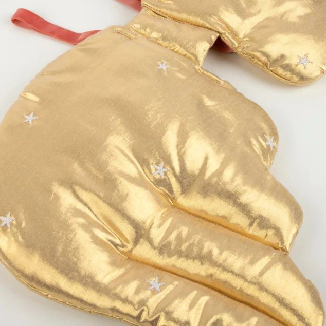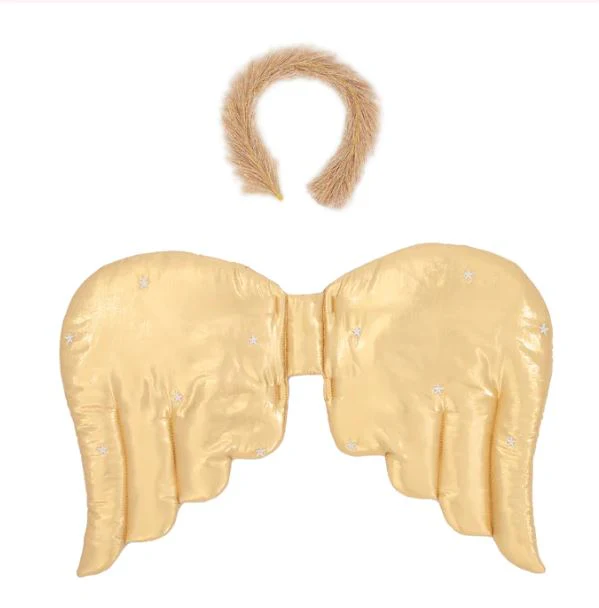 - Las alas acolchadas están hechas de tela lamé dorada brillante