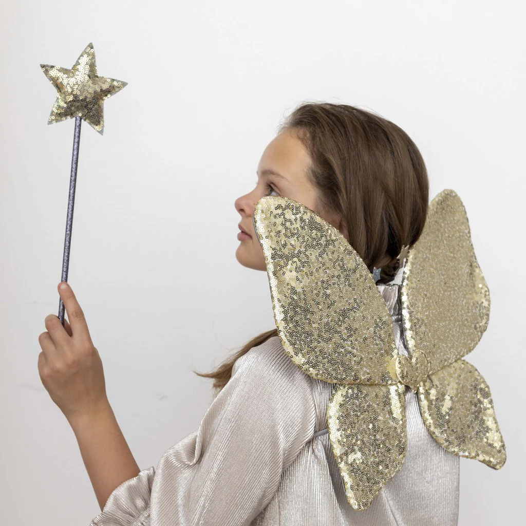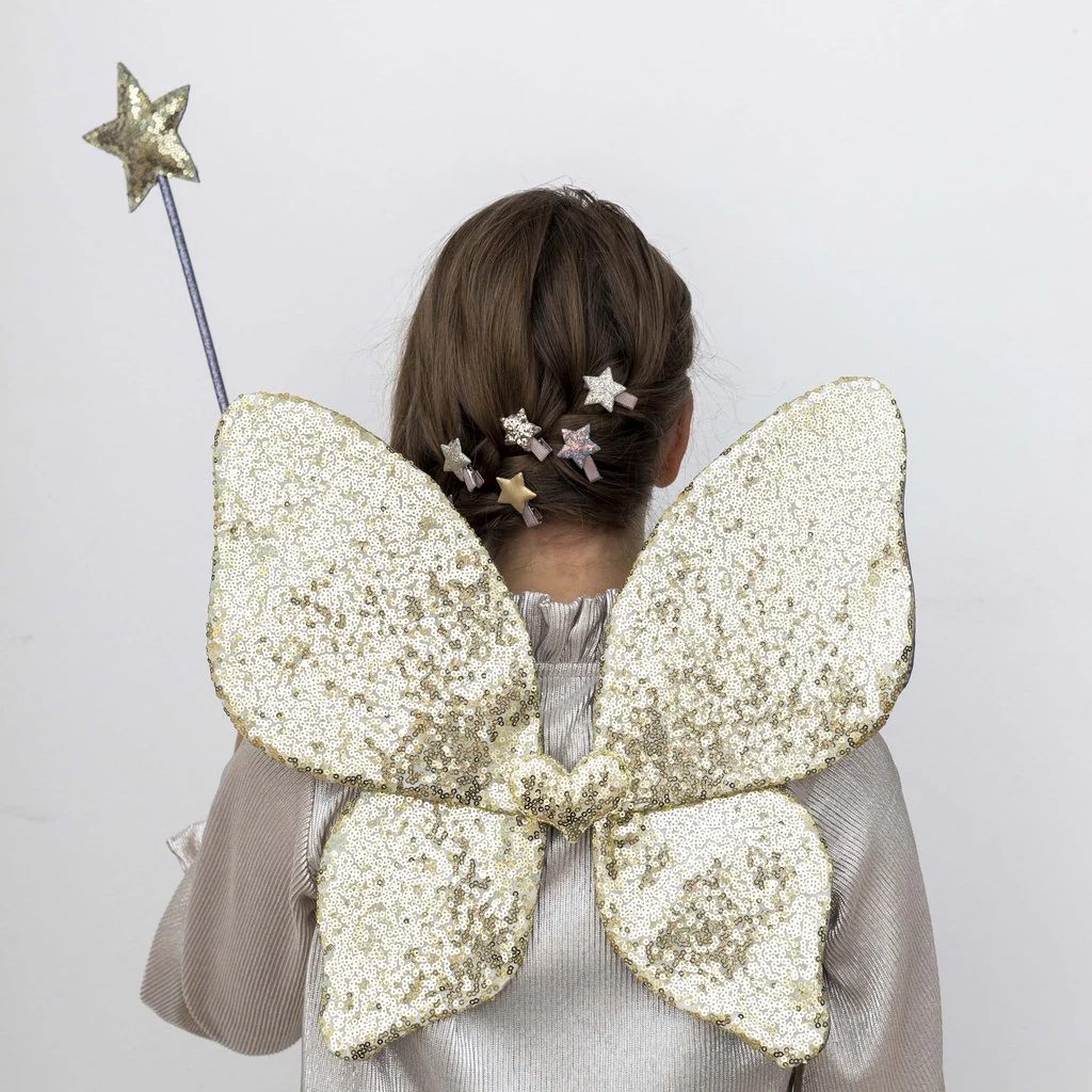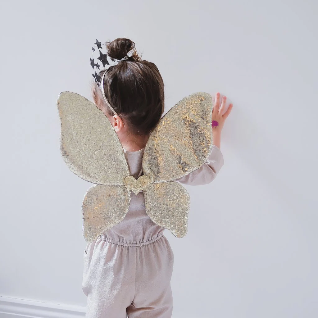 Brilla y centellea, reluce y resplandece con estas alas doradas que cortan la respiración. Completamente cubiertas en lentejuelas de colores, estas alas tienen tiras elásticas y un corazón de lentejuelas en el centro. Una idea mágica para un cumpleaños!