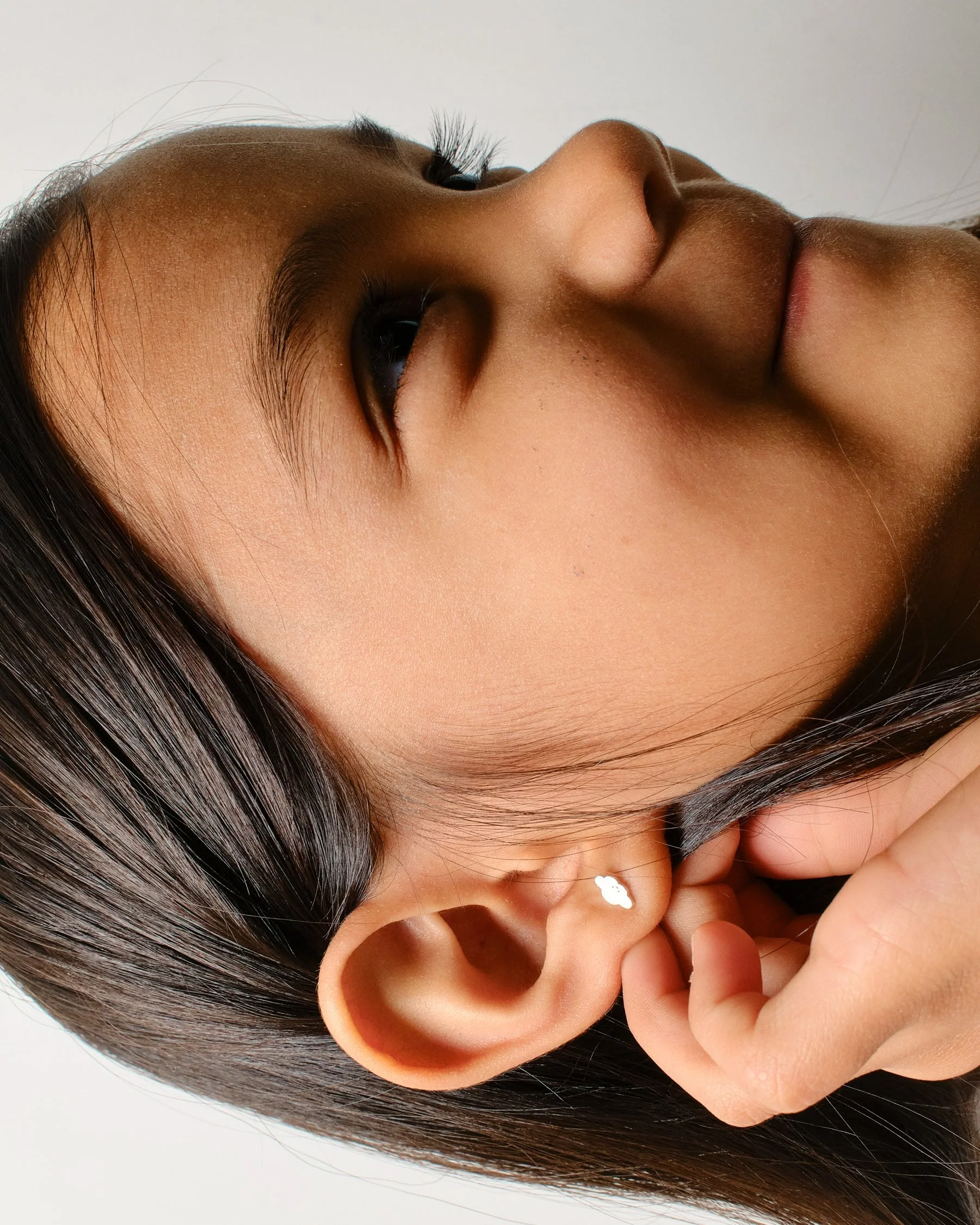 Par de aretes de plata en forma de nube con una carita grabada.