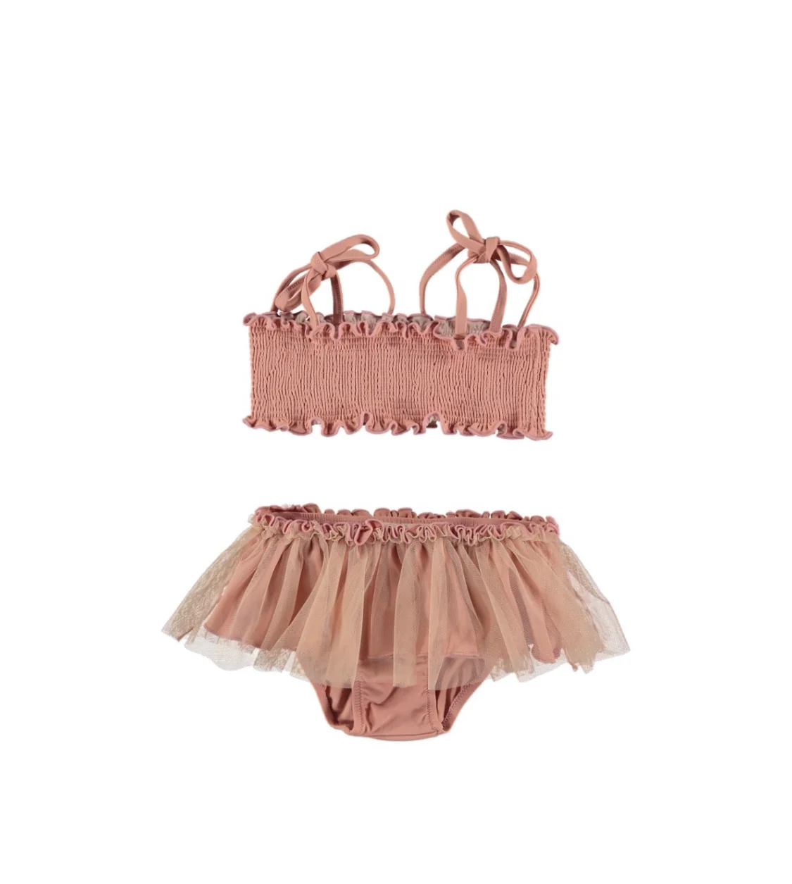 El sueño de cualquier pequeña bailarina: llevarse el tutú hasta a la playa. Pero no os dejéis engañar por el glamour y delicadeza de este dos piezas, realmente está pensado para para funcionar como ropa de baño. Su lycra es muy agradable y resistente y la parte de arriba se ajusta al cuerpo con el contorno fruncido y los tirantes.