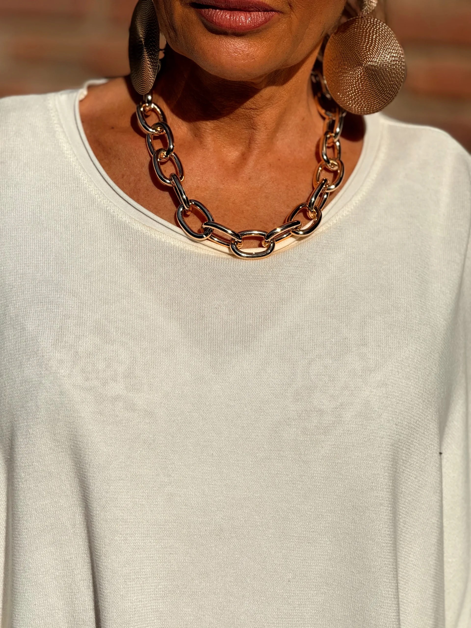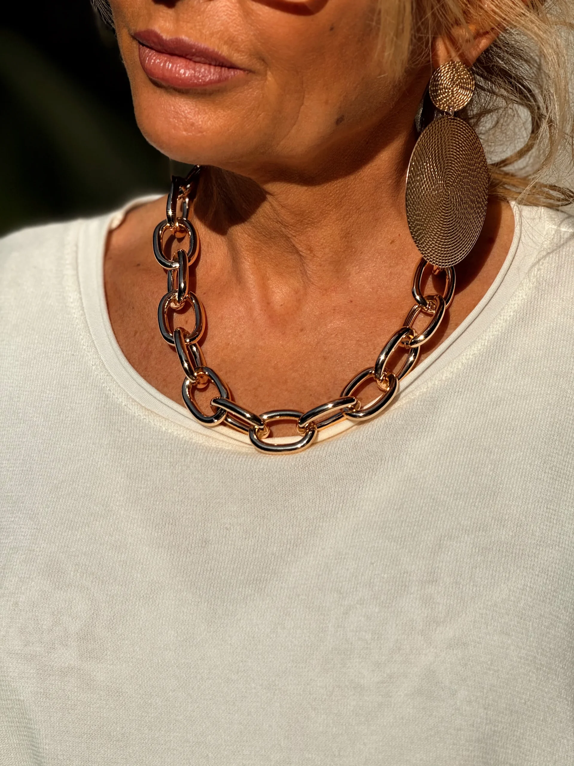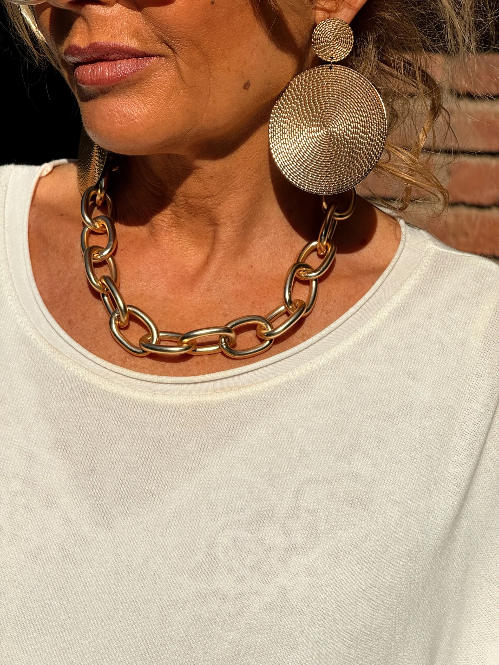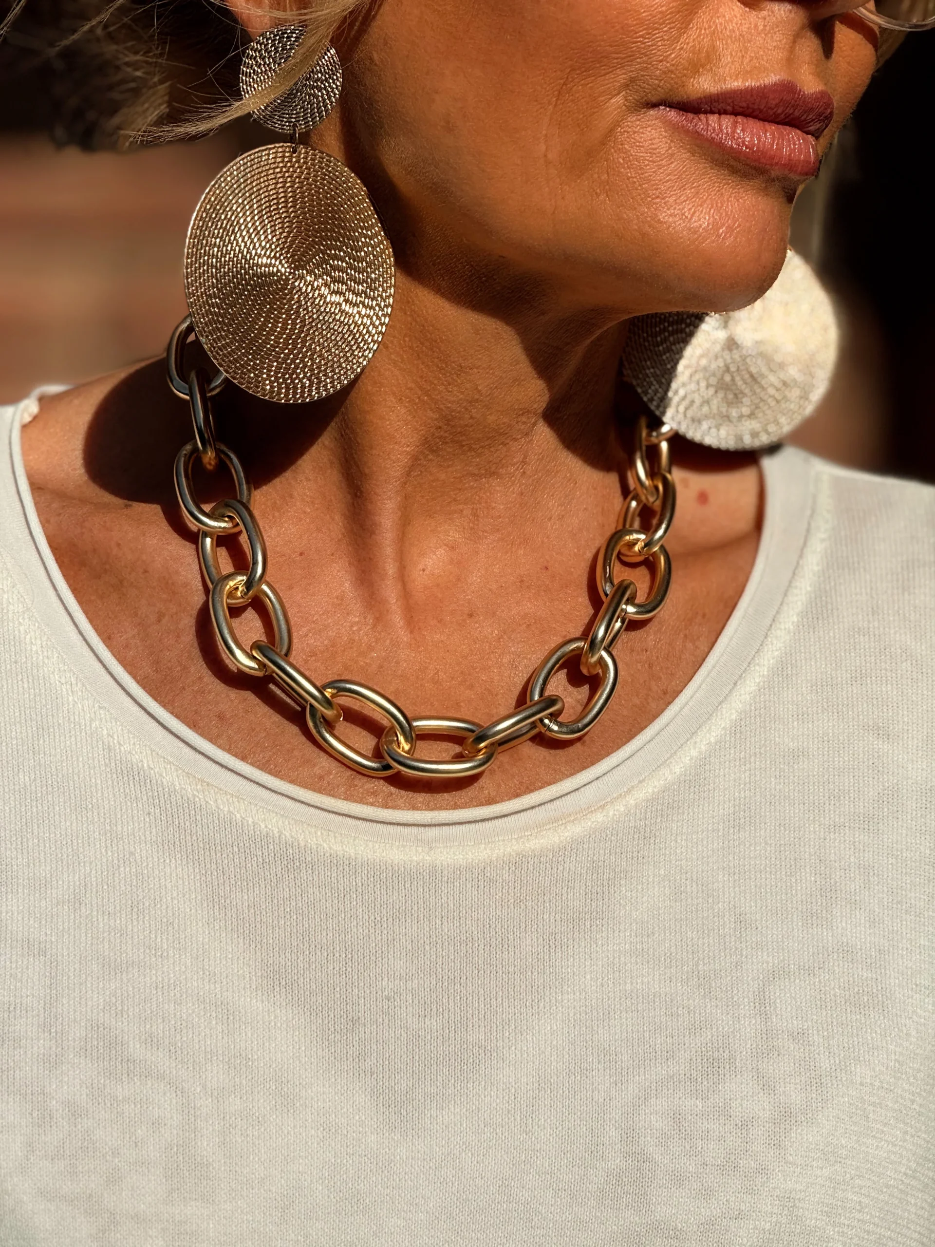 Cadena preciosa y muy elegante, con un diseño atemporal que realza cualquier look. Disponible en acabado dorado o mate. Un complemento sutil pero con mucha personalidad, perfecto para llevar solo o combinado con otros collares.✨