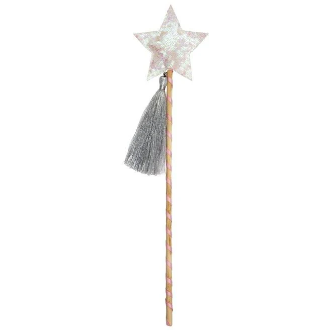 Este conjunto es perfecto, se compone de una preciosa capa llenita de lentejuelas iridiscentes en tonos rosas que entusiasmará a las más pequeñas (o no tan pequeñas) con cuello de tul y una varita con lentejuelas a juego y borlón plateado.
