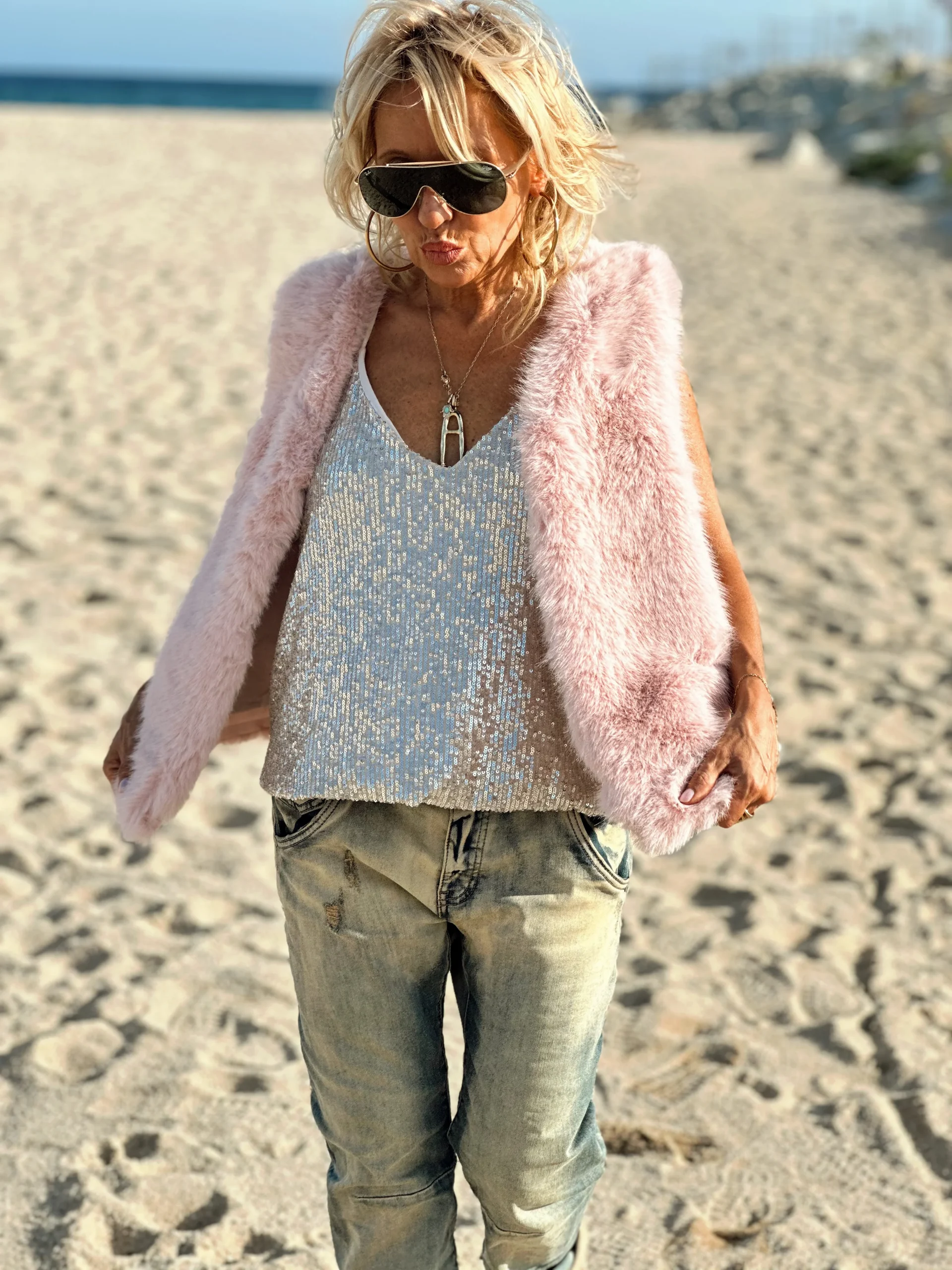 ¡Este hermoso chaleco de pelo sintético es simplemente irresistible! Un imprescindible en tu armario, perfecto para darle un toque de dulzura y estilo a cualquier conjunto. ¡No puede faltar en tu colección!✨