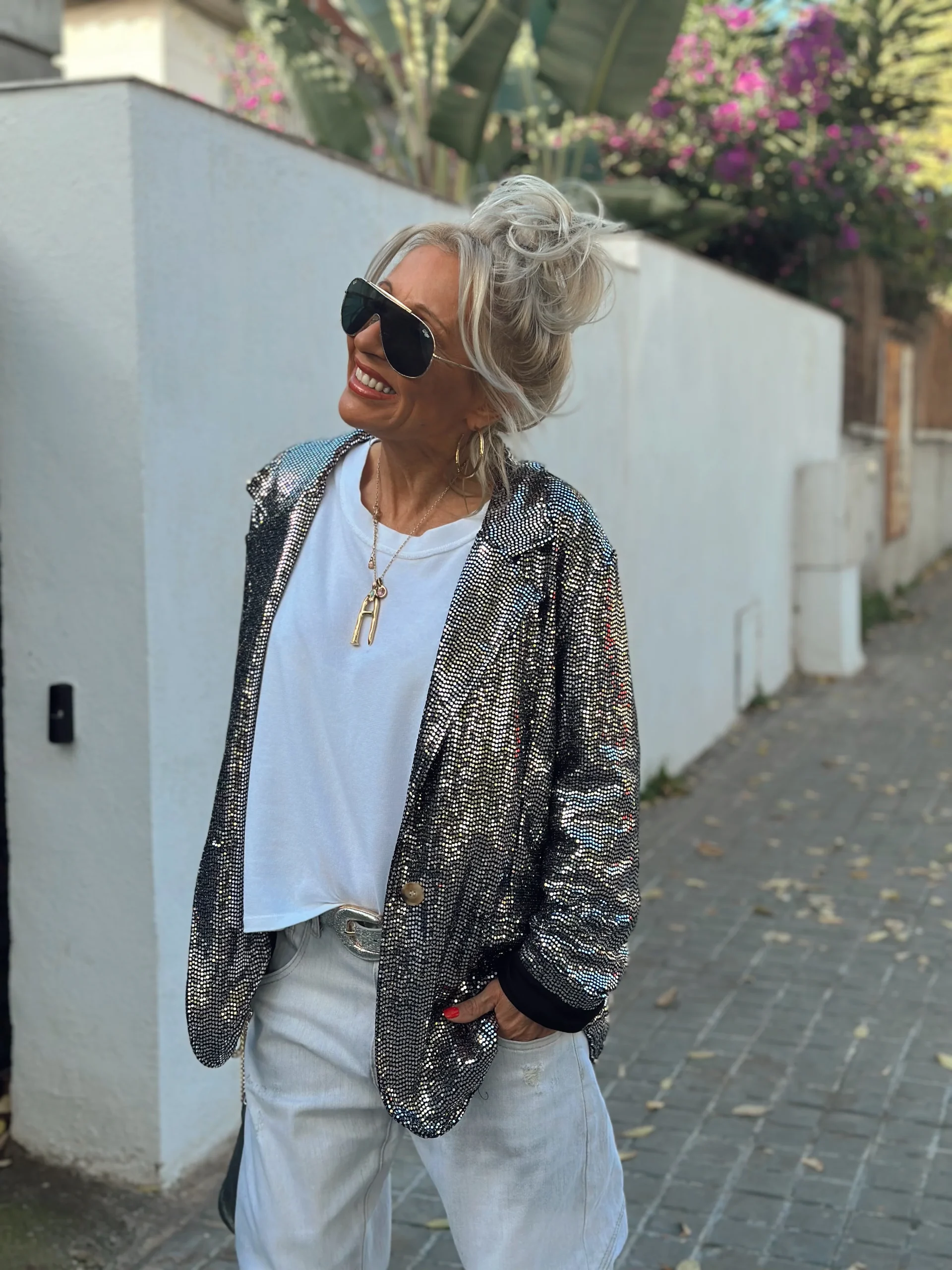 Chaqueta de lentejuelas espectacular, perfecta tanto para las fiestas como para cualquier ocasión especial. Incluso en verano, aporta un toque único a cualquier look. Fácil de combinar, esta prenda transforma cualquier outfit en algo realmente especial.✨