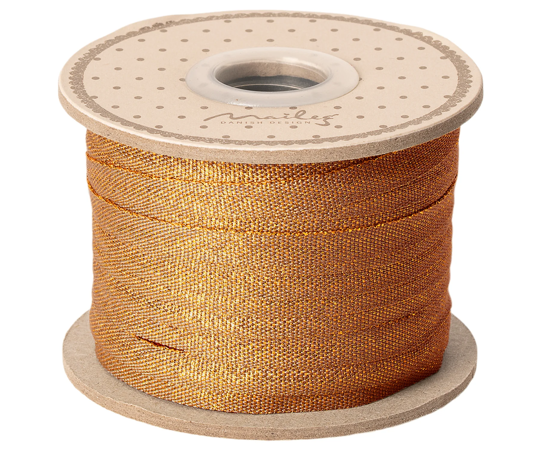 No te limites al papel de regalo, completa una presentación de lujo para tus regalos con la cinta perfecta. Estas bobinas contienen 25 metros de cinta de tela de gran calidad en un color dorado subido, un ocre metalizado, perfecto para nuestros papeles de regalo cozy christmas, toys, angels…