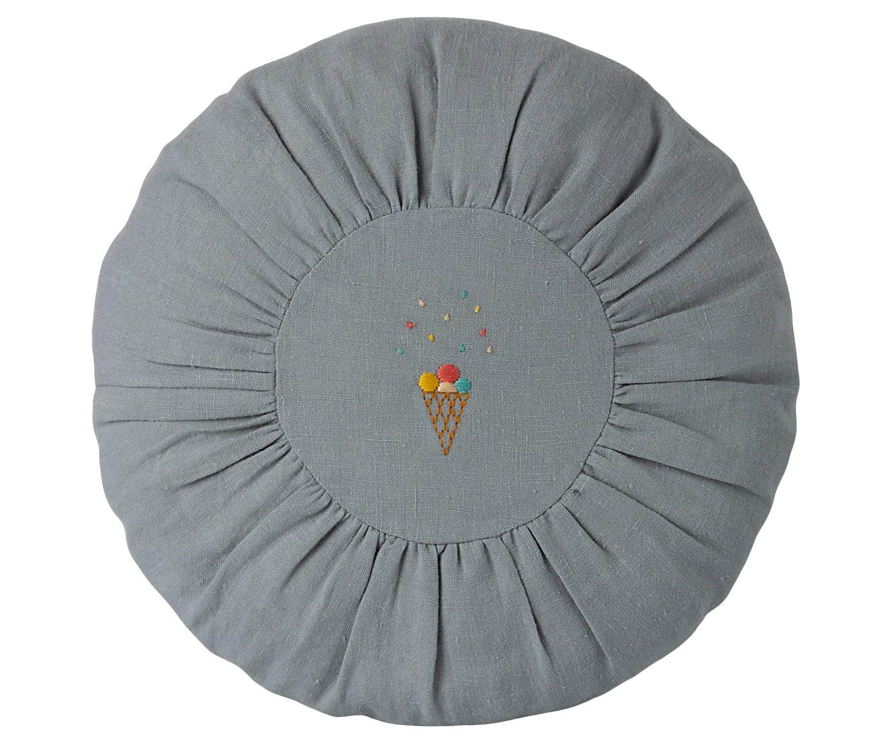 Cojín con funda hecha en lino natural con un delicado color verde musgo y detalles bordados con motivos de setas del bosque