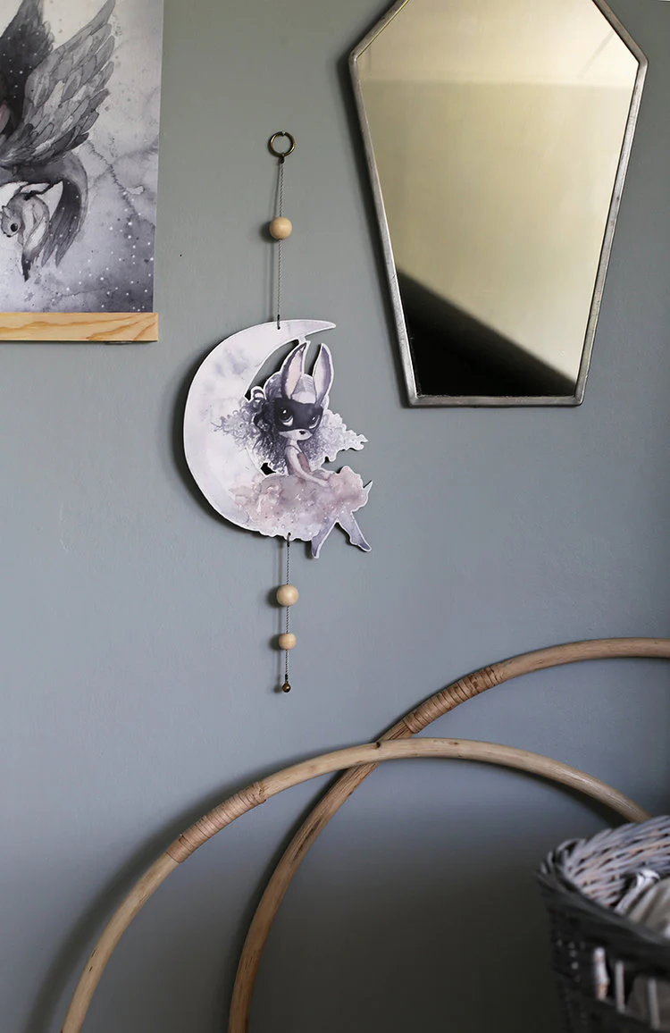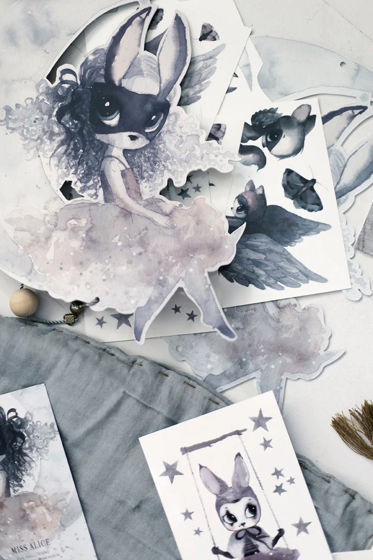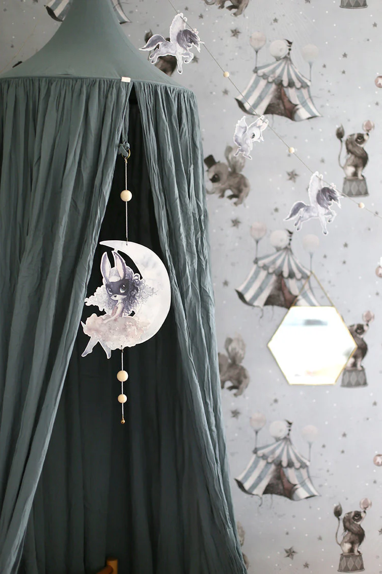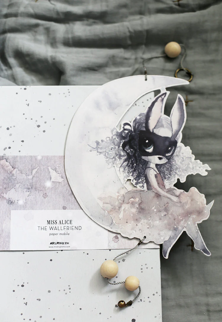 Adorable móvil de papel para habitación infantil. El móvil viene en 3 diferentes motivos, Miss Alice, Miss Astrid y el Gorrión Volador, los tres con bolitas de madera en una cinta gris rematada en una campanita. El colgante está impreso en papel muy grueso por amLáminabos lados. Ideal para colgar del techo, de la pared, sobre la cama o cuna…