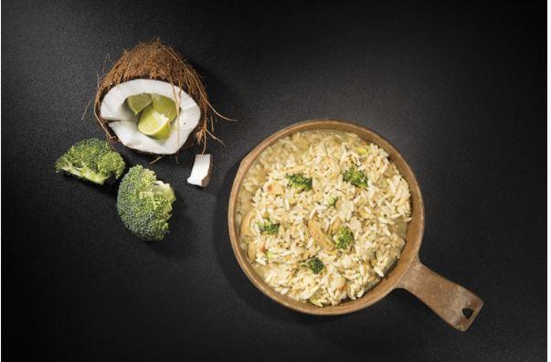 arroz, filete de merluza (20%), brócoli, caldo de pescado, leche de coco, cebolla, aceite de colza, ajo, comino molido, corander, pasta de curry, zumo de lima