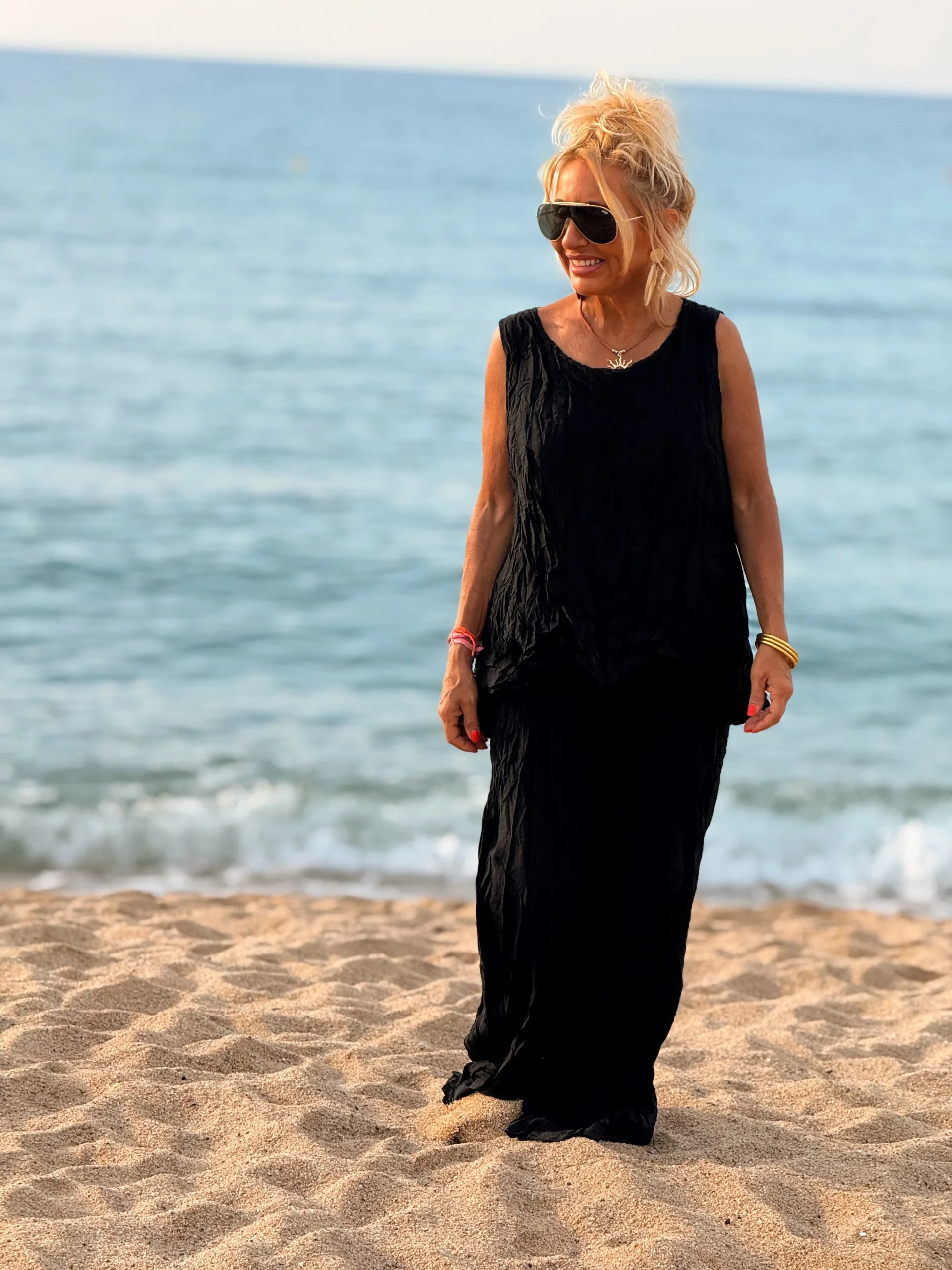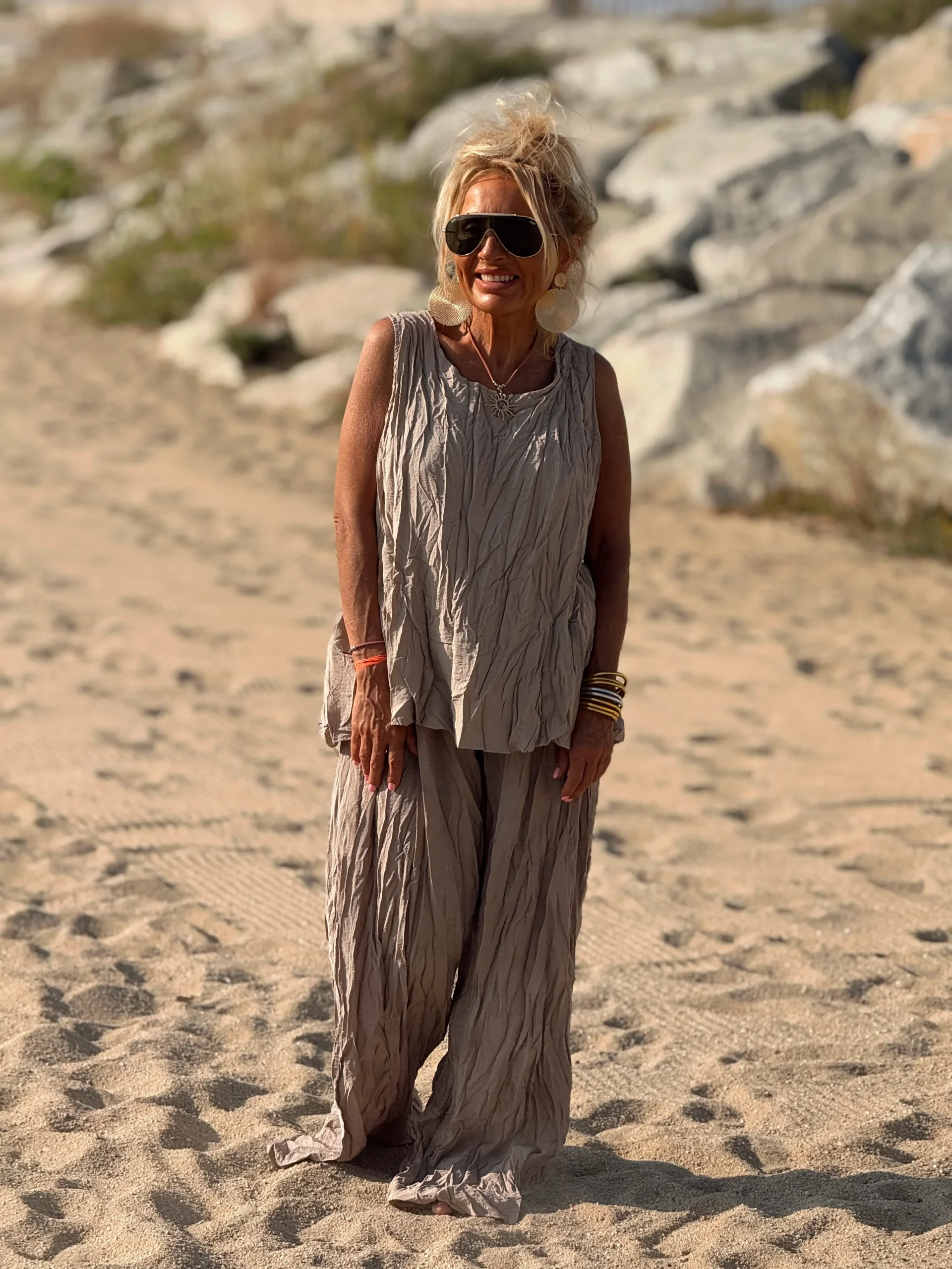 Este conjunto está formado por un top tipo blusa y un pantalón con cintura elástica. El tejido es plisado y con un efecto arrugado que se lleva así, y es justamente lo que le da todo su estilo y personalidad.
