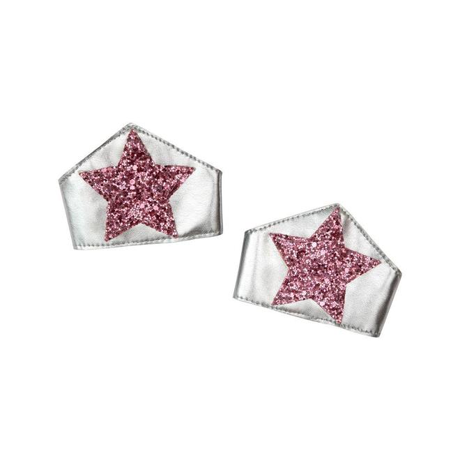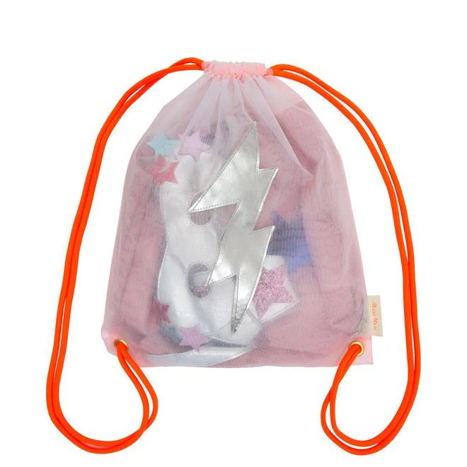 La superheroína con más glamour del universo! Capa de tul con apliques metalizados de estrellas, rayo y corazones, antifaz plateado con cinta glitter y muñequeras con estrellas, todo contenido en una mochilita de organza ¡Es una maravilla! Además puedes llevar a tu muñeca a juego contigo.