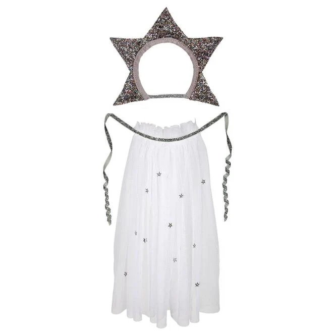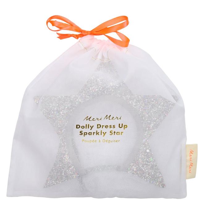 Este disfraz para tu muñeca Meri Meri está compuesto por una capa brillante con estrellas cosidas y un bonito tocado en forma de estrella.