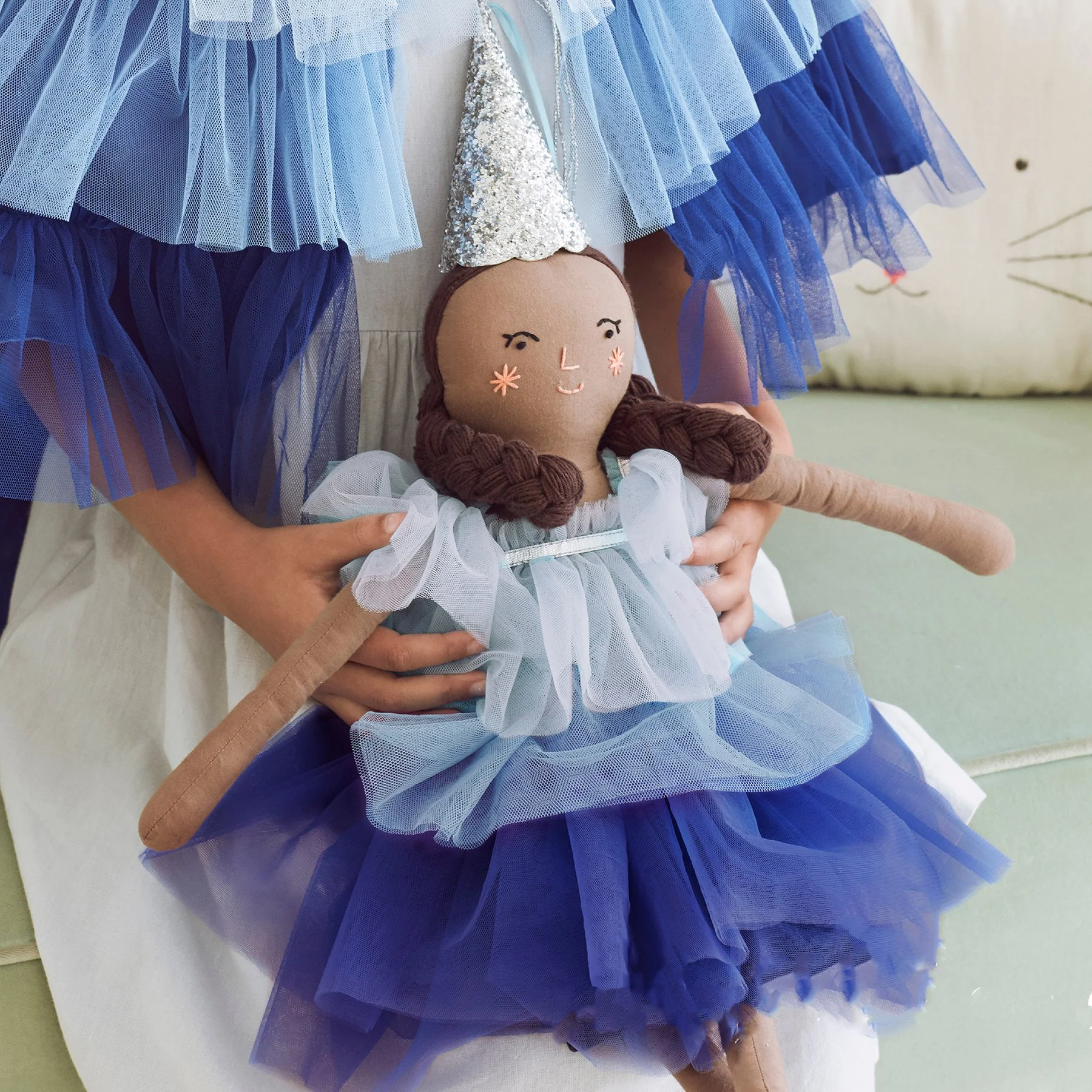 Esme es una muñeca muy estilosa perfecta para un juego imaginativo… y achuchones. Tiene un precioso pelo trenzado, un vestido en azules degradados con volantes de gasa, un sombrero en glitter plateado con cintas (que se puede quitar y poner para que lo usen los niños también gracias a su clip!)