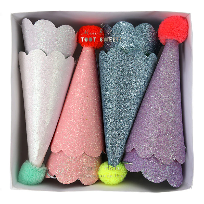 Alegres gorritos de fiesta con pompón en brillantes colores flúor y purpurina plateada.