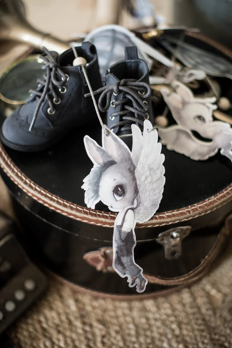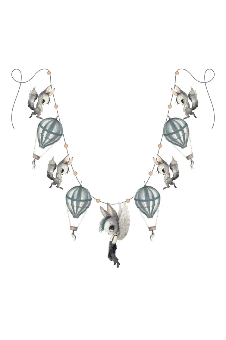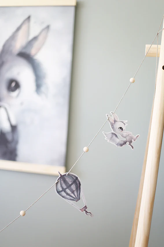 Cuelga tu guirnalda contra la pared, en una ventana, del techo… incluye 1 colgante Billy, 4 conejitos y 4 globos.