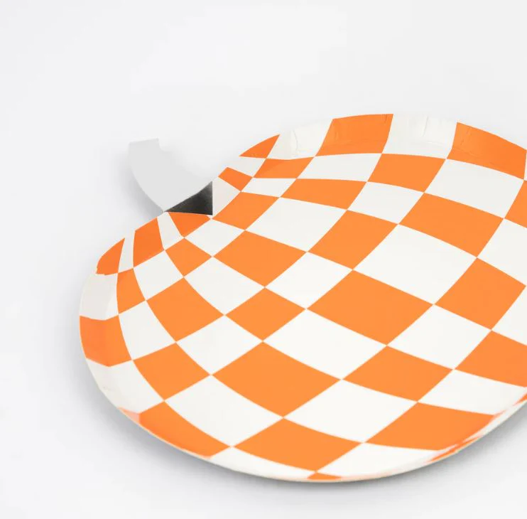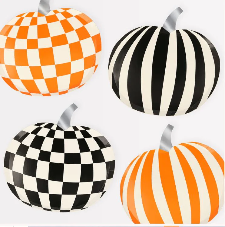 Hemos unido colores tradicionales de Halloween de naranja, blanco y negro con diseños retro llamativos para un aspecto de declaración. ¡Estas placas de calabaza están garantizadas para que su mesa de fiesta se vea totalmente maravillosa