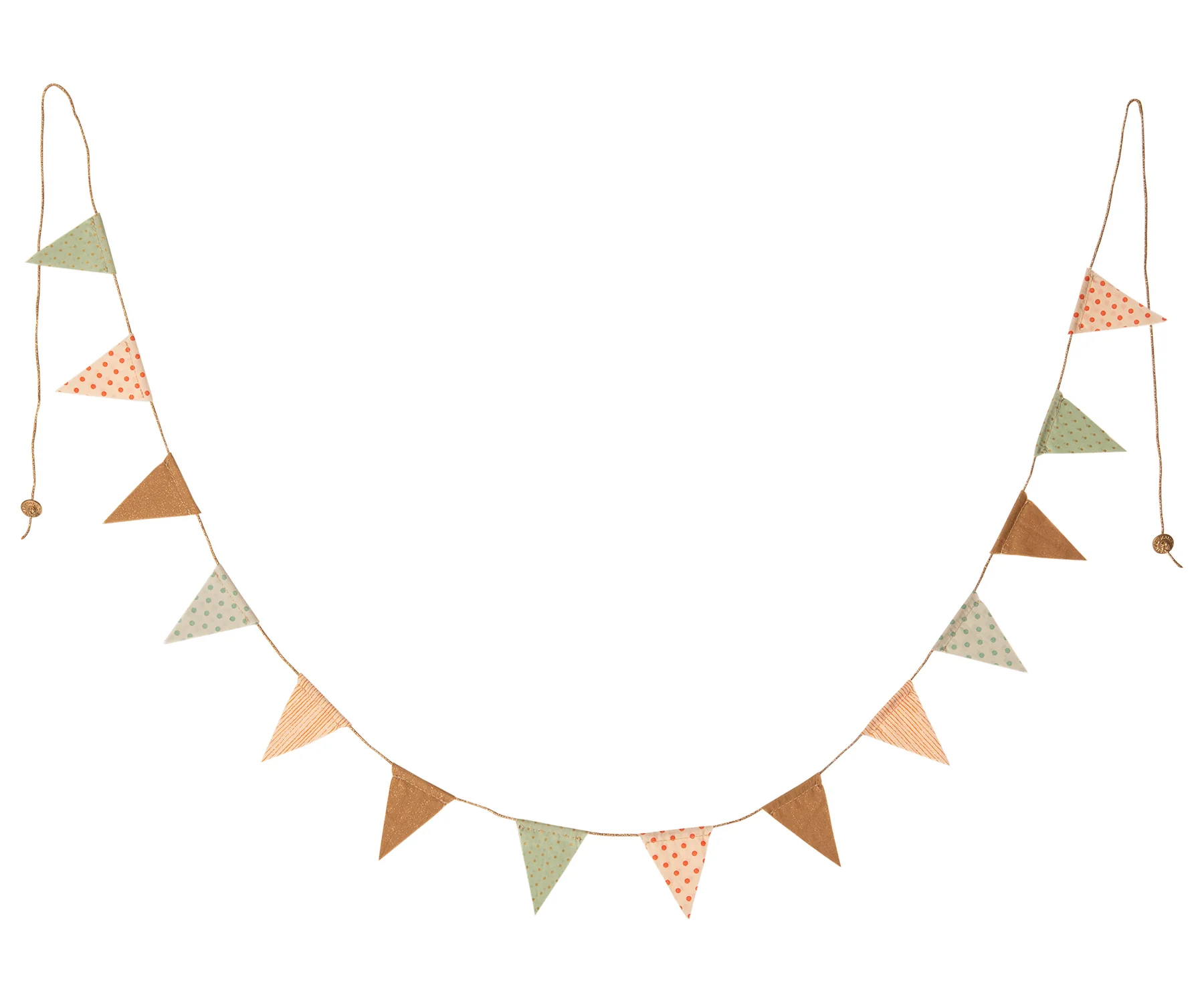La guirnalda tiene 14 banderines MINI unidos por un cordón elástico dorado y mide 160 cm