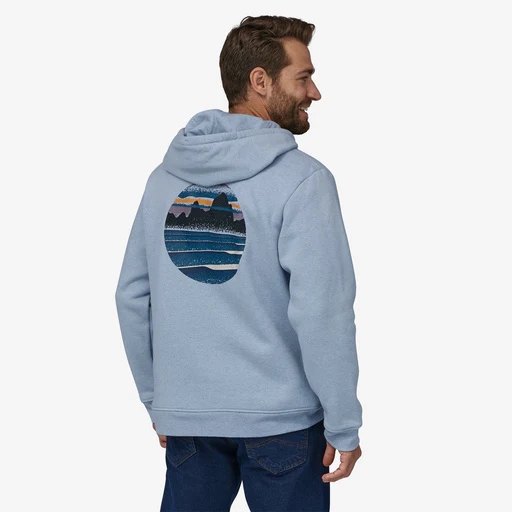 El diseño del hoody Skyline Stencil exhibe el perfil del Monte Fitz Roy en el ocaso. Está estampado con serigrafía sobre tela reciclada 100% pos-consumo. Logramos reducir la necesidad de utilizar materiales nuevos al emplear retazos de tela y botellas reciclados. Con Certificación Fair Trade™.