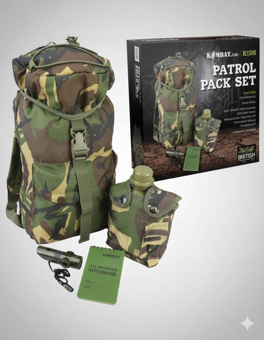 El Kit de Explorador Infantil Kombat UK DPM Woodland es el conjunto ideal para que los más pequeños vivan aventuras al aire libre con un auténtico estilo militar.