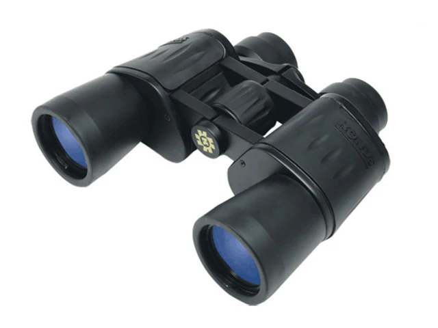 Prismático clásico Konusvue 10×50 W.A. con aumento 10x, diámetro de objetivo 50mm, enfoque central y campo visual de 122m a 1000m. Adaptable a trípode. Incluye funda.