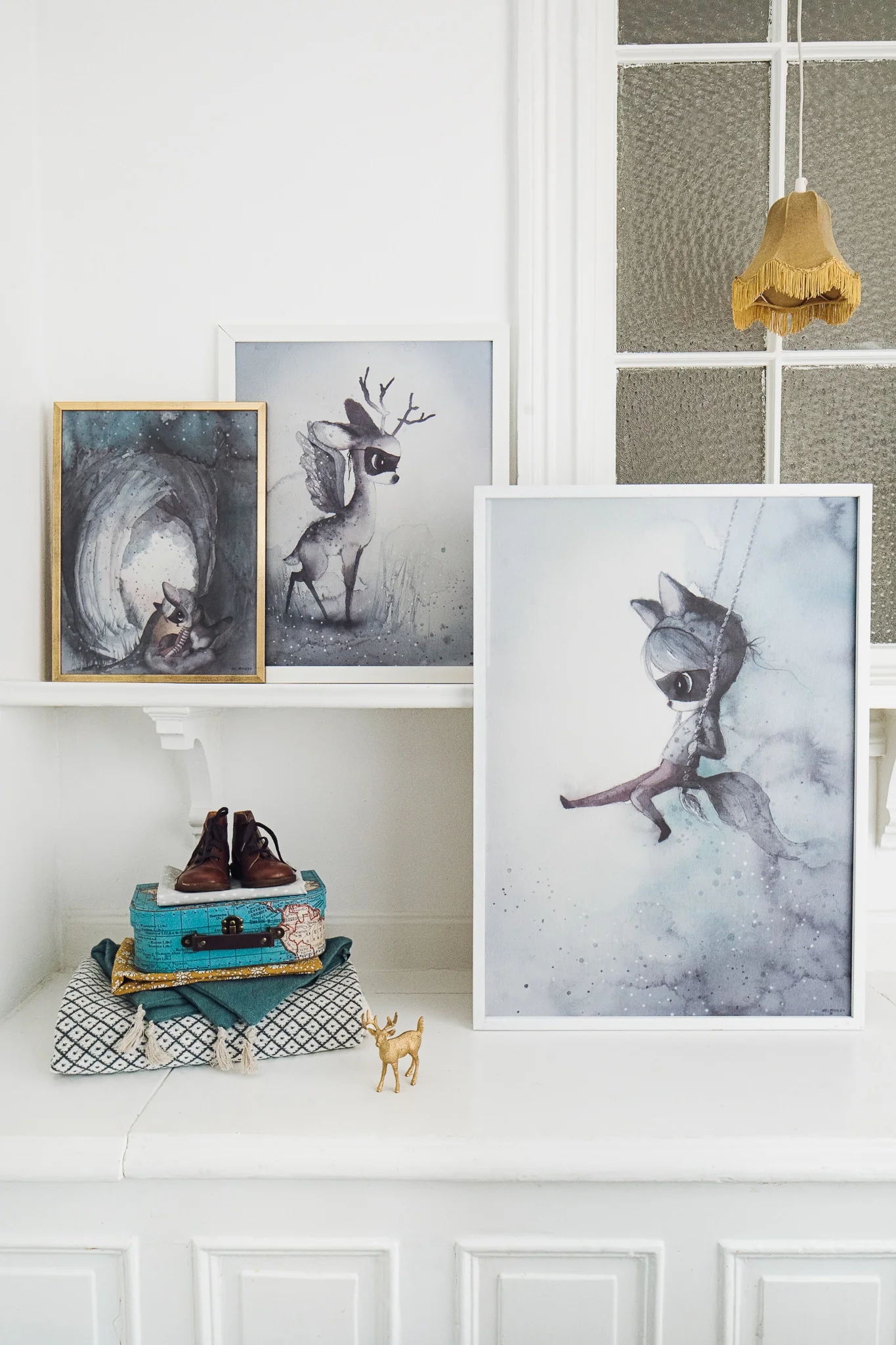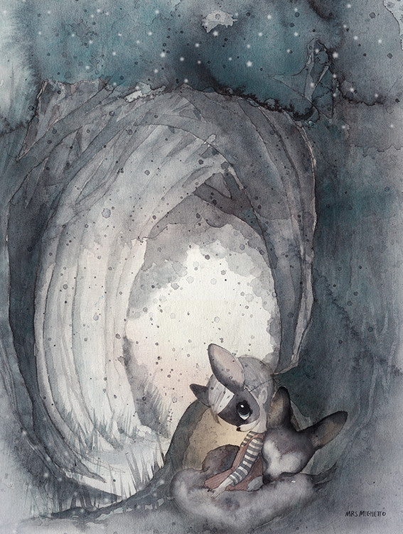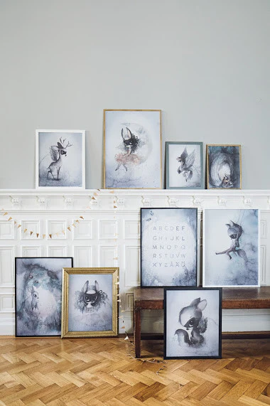Mrs Mighetto no solo crea láminas bonitas, va más allá: cada colección es una concepción global de historia, personajes y coherencia estética, inventan mundo misterioso, personajes fascinantes e hipnóticos plasmados con una delicada paleta de colores propia con un marcado estilo de autor, apta tanto para dulces dormitorios infantiles como para decoraciones más adultas.