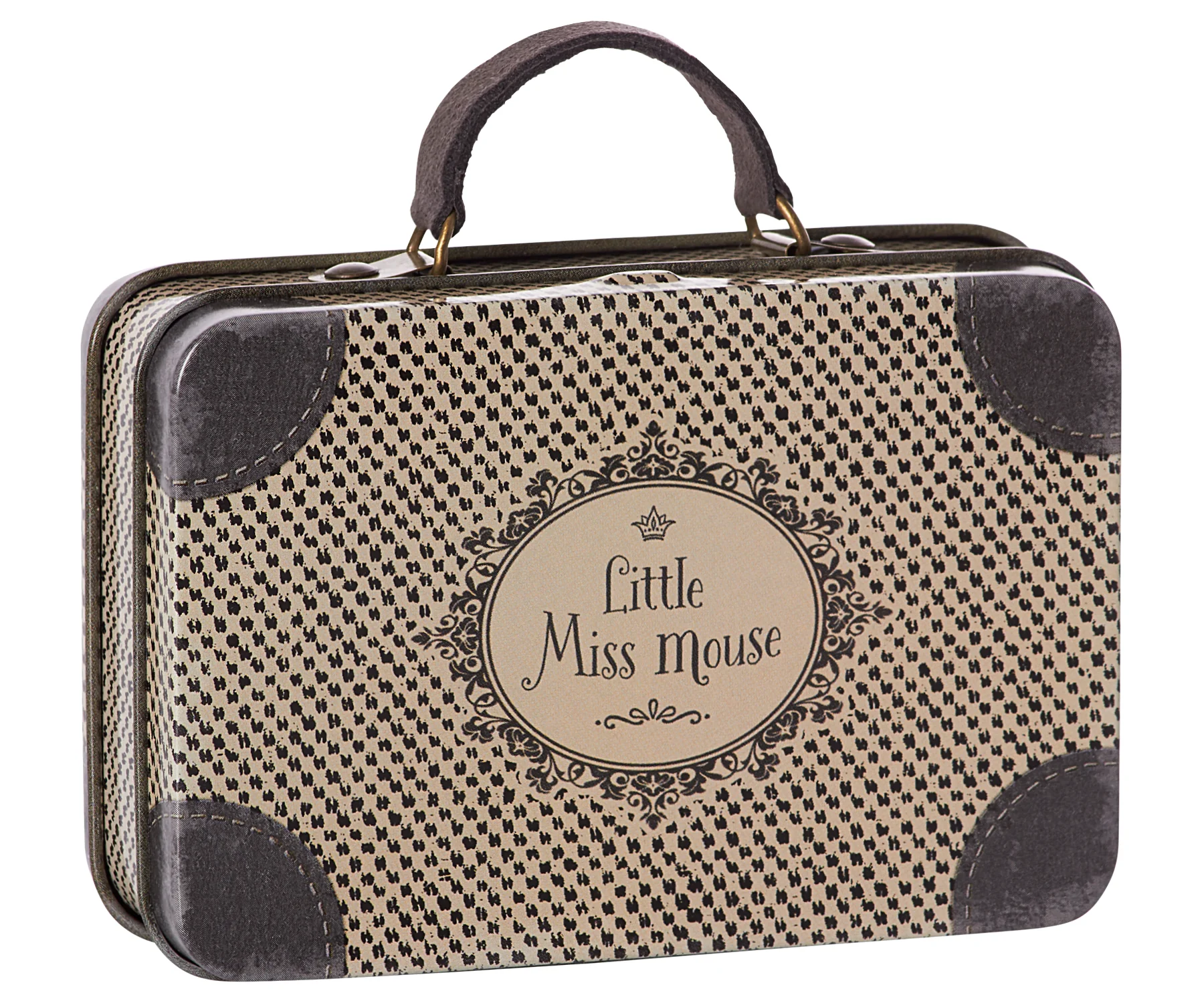 Puede que no lo sepas, pero los conejitos y ratoncitos Maileg son muy viajeros, así que tienen una colección de maletas ideales. Esta es una opción muy elegante con sus tonos en beige y negro y su aire vintage.