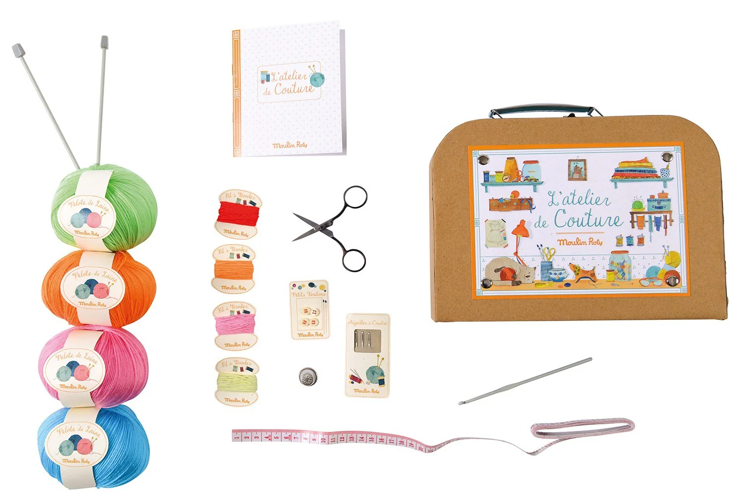 Para los niños que tengan curiosidad por iniciarse en la costura se ha reunido en este maletín todo lo necesario para iniciarse al ganchillo, al bordado, a la costura, al punto… Contiene todos los elementos para aprender como hilo de colores, agujas, tijeras, delicado. Para pasar buenos momentos y pedir a mamá o a la abuela que te enseñe todo lo que sabe.