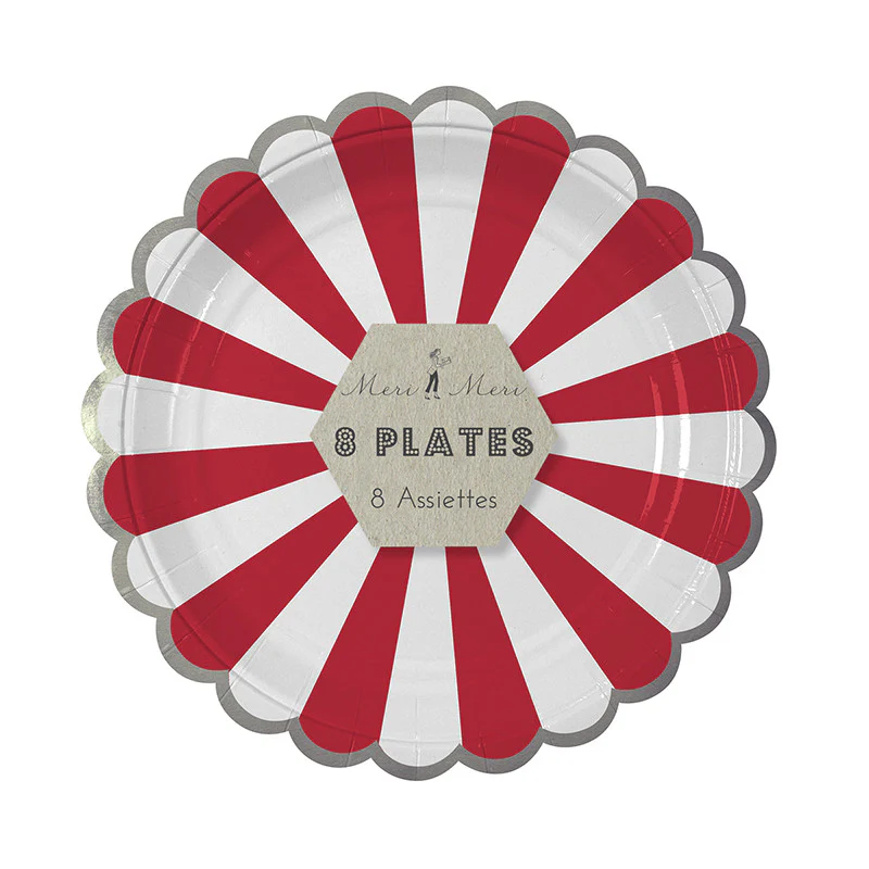 Estos platos están decorados con un patrón radial de rayas en color rojo y blanco y se rematan con un borde ondulado en plata. No te limites a coordinar dentro de la misma colección, ¡Meri Meri tiene muchas colecciones coordinables entre sí! .