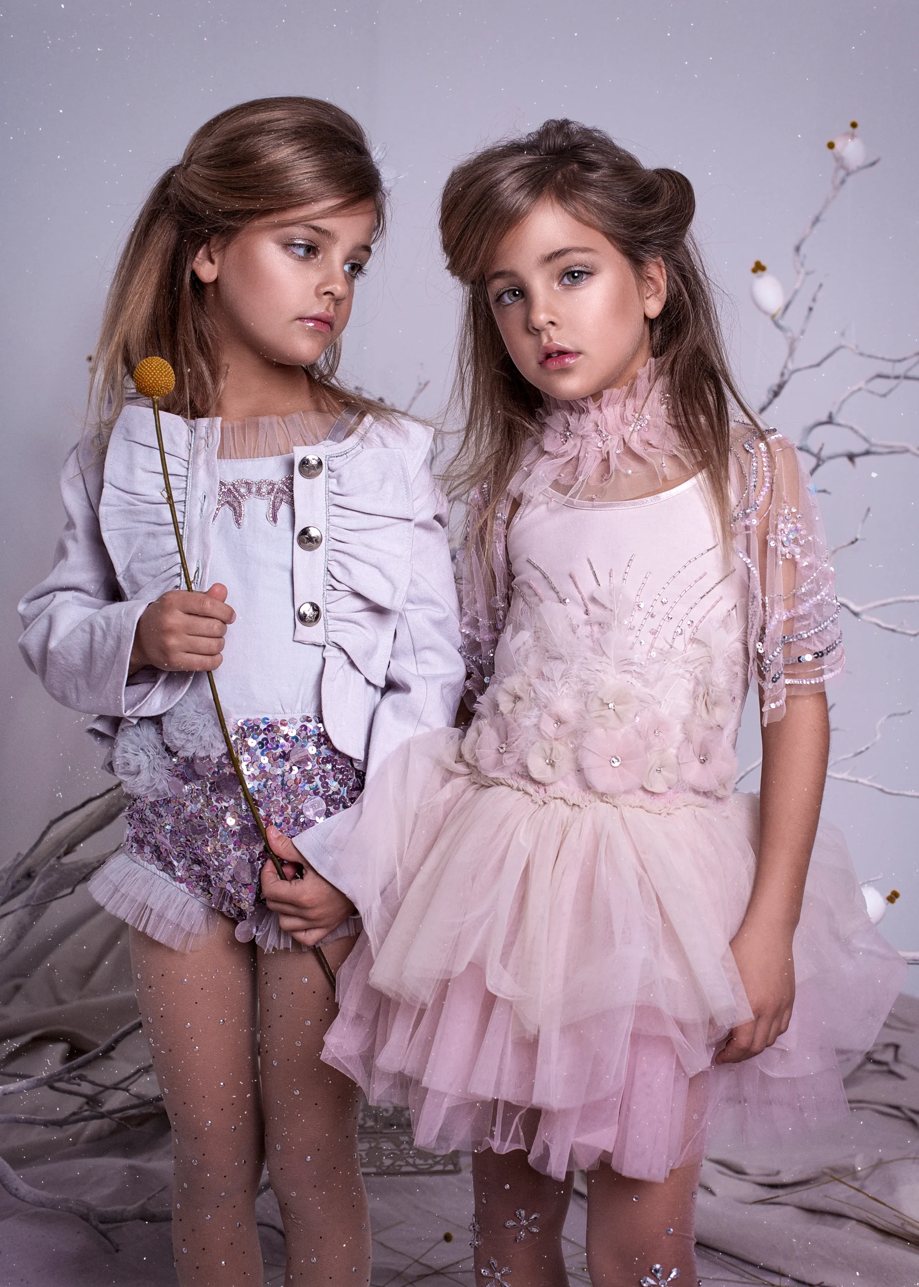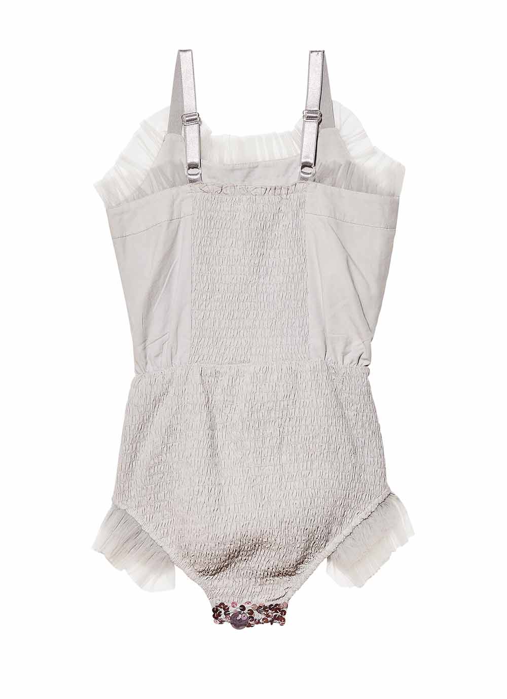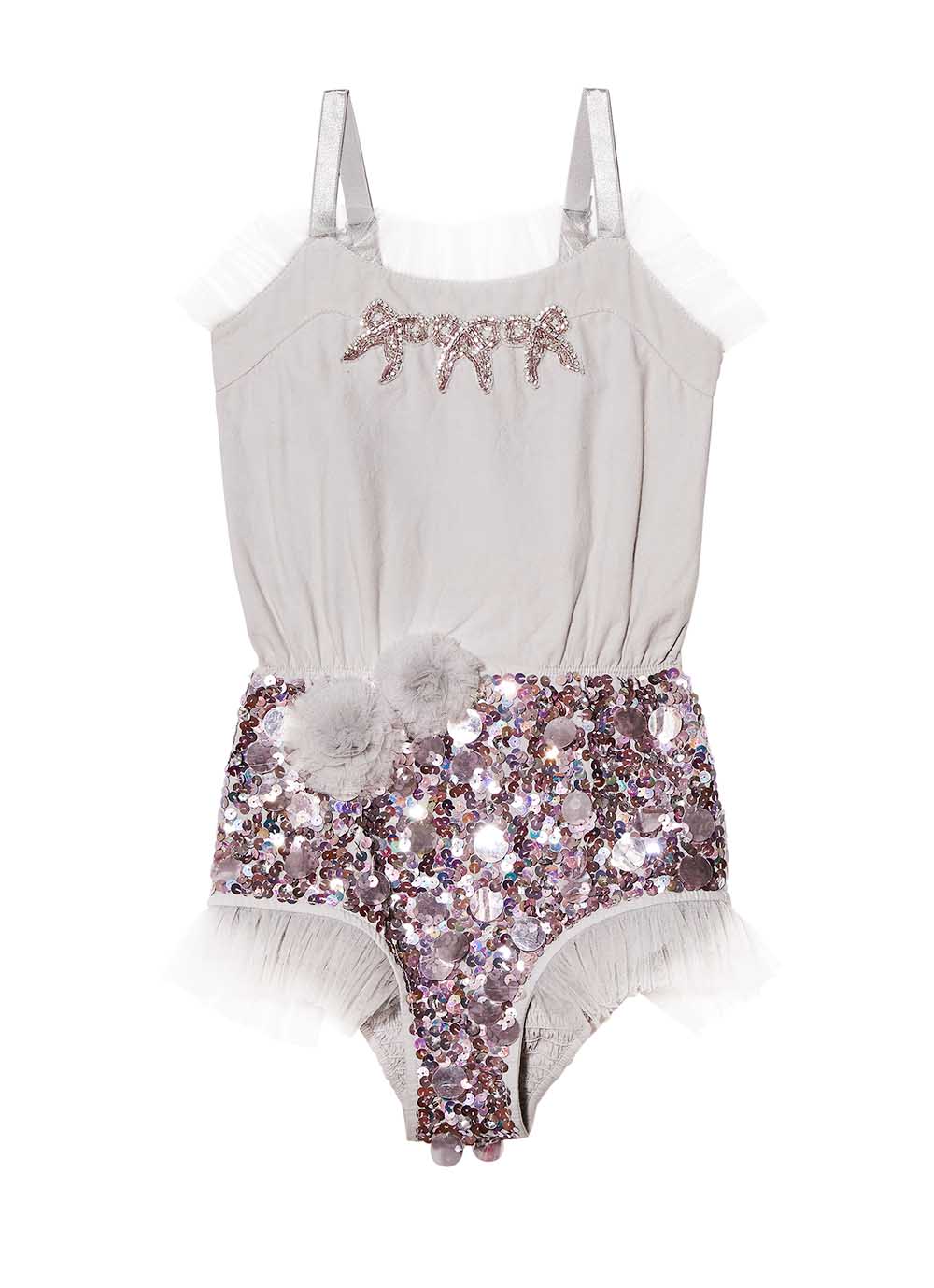 El mono Little secrets es perfecto para disfraces en casa o sobre el escenario. Además, la cámara adora todas esas chispas brillantes de la luz reflejada en su pedrería. Shorts escarchados en cuentas de cristal brillante, remate de tul cosido por manos expertas en el escote y bordes del short, un trío de lazos hechos con lentejuelas plateadas y dos pompones de tul… esta pieza de arte está llena de detalles.