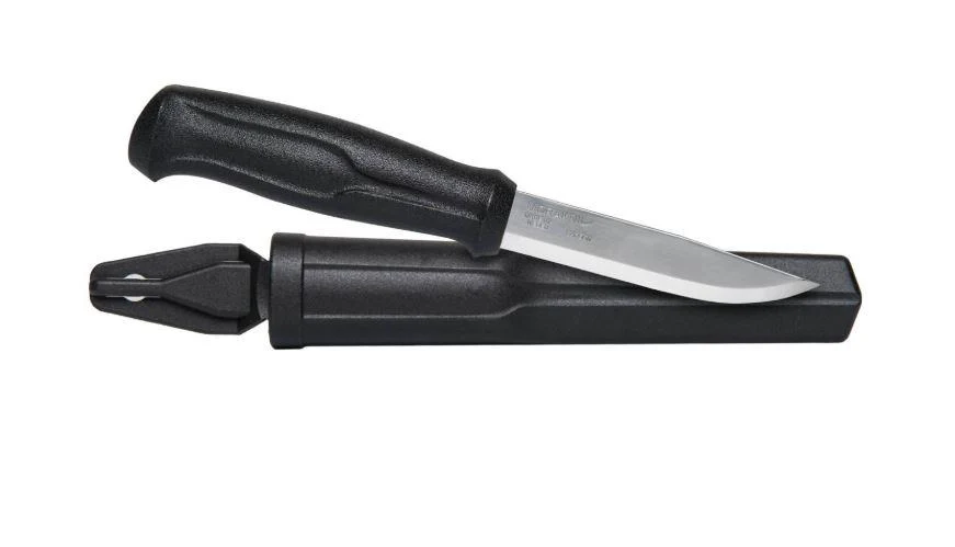 Una herramienta recreativa para exteriores con una hoja hecha de acero al carbono y un mango de polímero negro resistente a los golpes.
