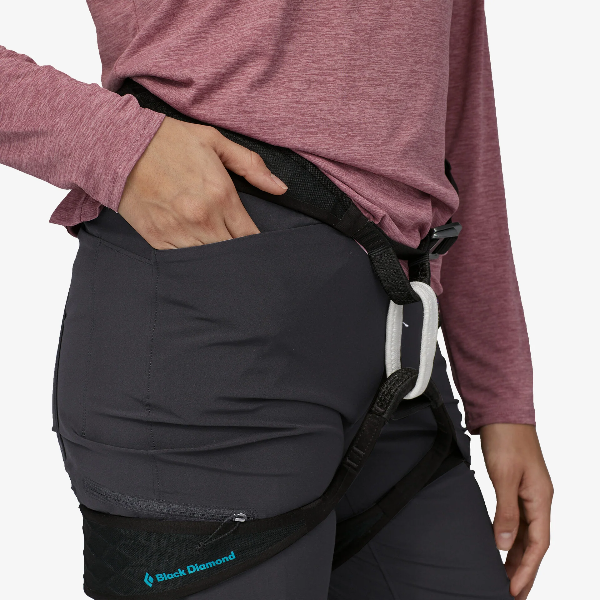 • Los bolsillos delanteros y traseros de inserción tienen construcción plana para mayor comodidad debajo de un arnés