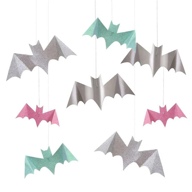 - Los murciélagos están diseñados desde papel grueso, y rematados con glitter ecológico en un lado y una lámina de plata brillante en la inversa.