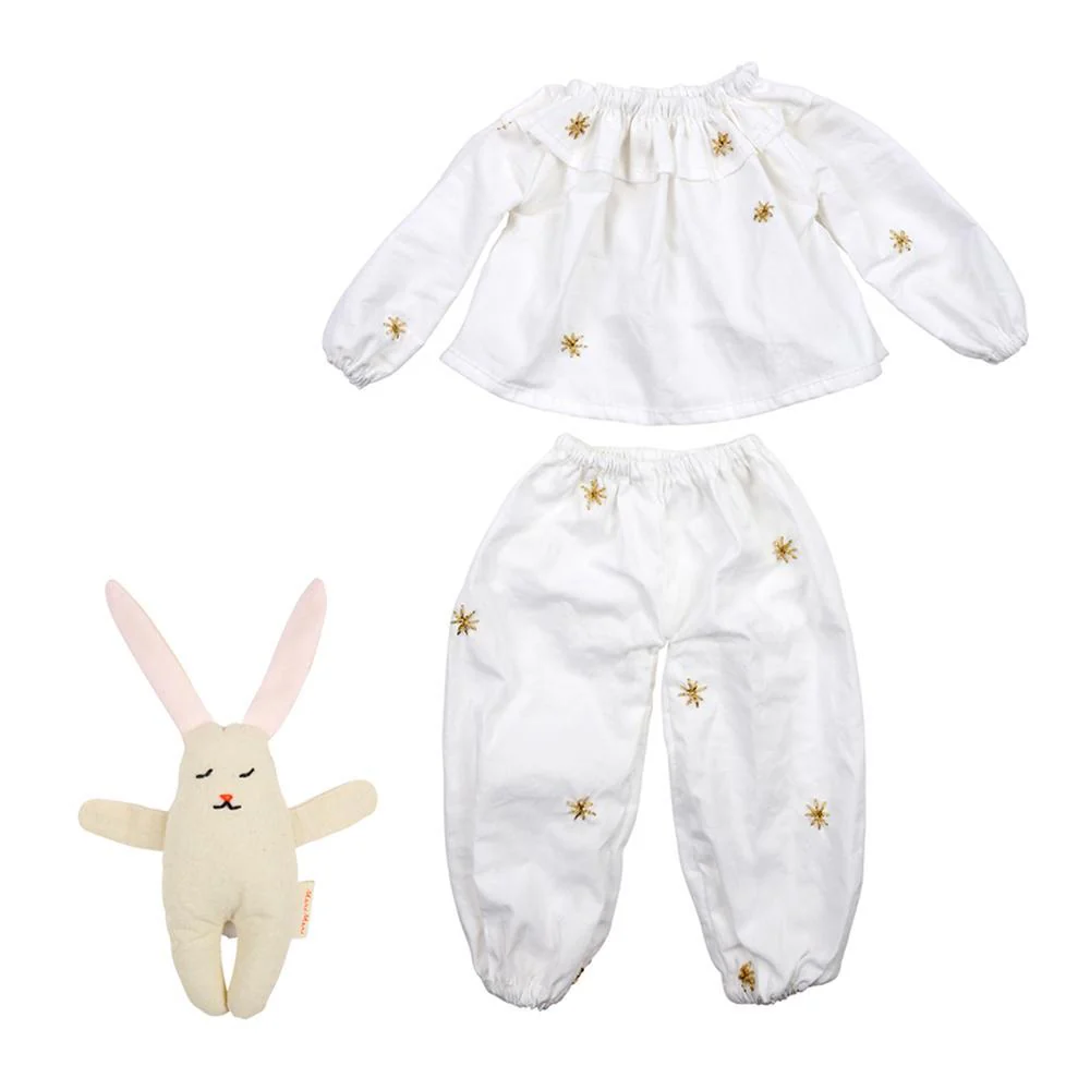 Jugar con a vestir y desvestir muñecas es un alimento para la imaginación de los pequeños. Este conjunto de ir a dormir presenta un pijama de algodón decorado con estrellas bordadas y un achuchable juguete de peluche, todo contenido en una delicada bolsa de organza (muñeca no incluida)
