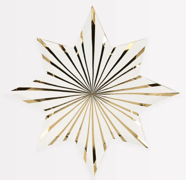 Estos platos estrella especiales lucirán brillantes en su mesa de fiesta, serán una decoración en sí mismos. Están hábilmente elaborados con dos diseños que se complementan entre sí: uno blanco con papel de oro y el otro lámina de oro con blanco.
