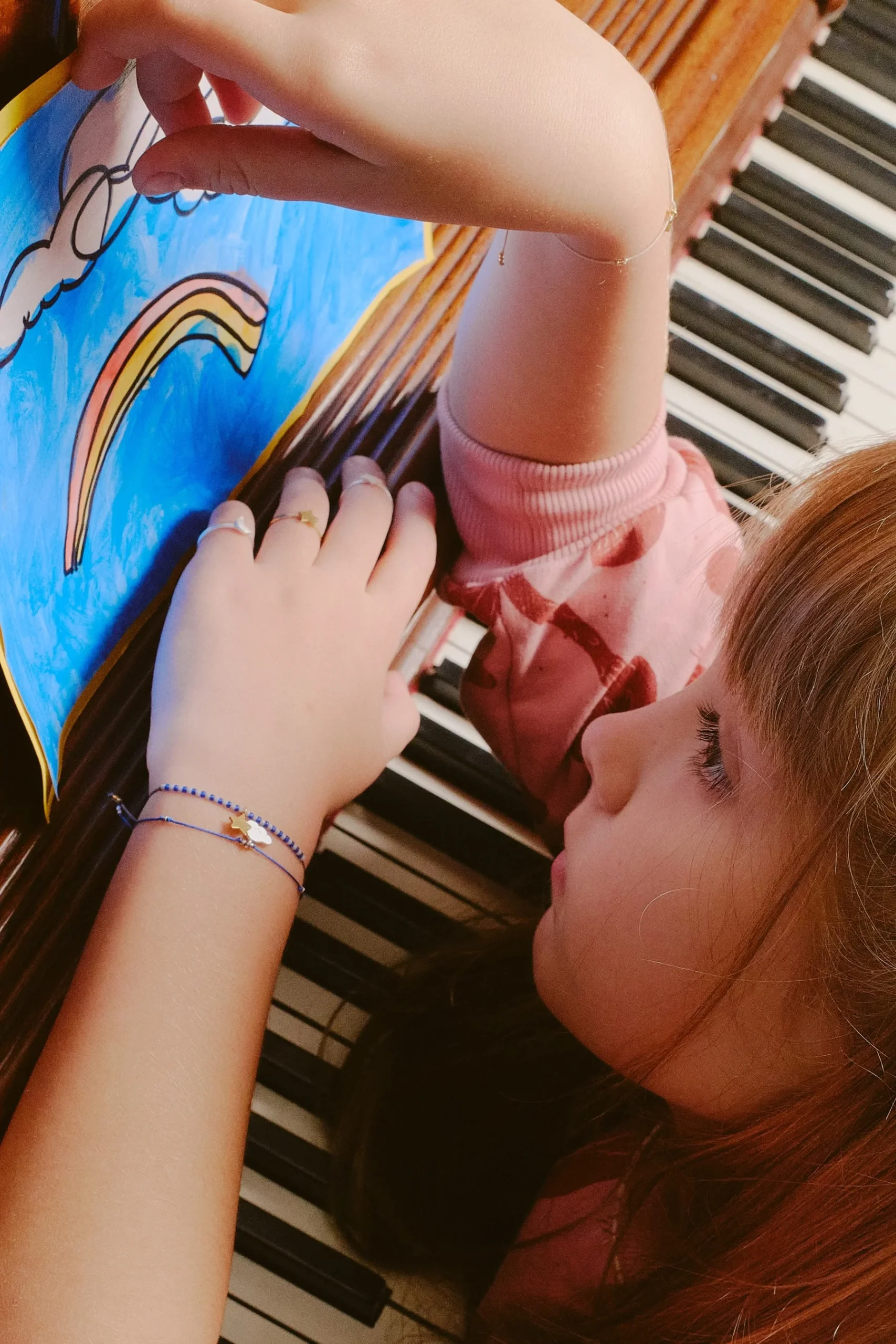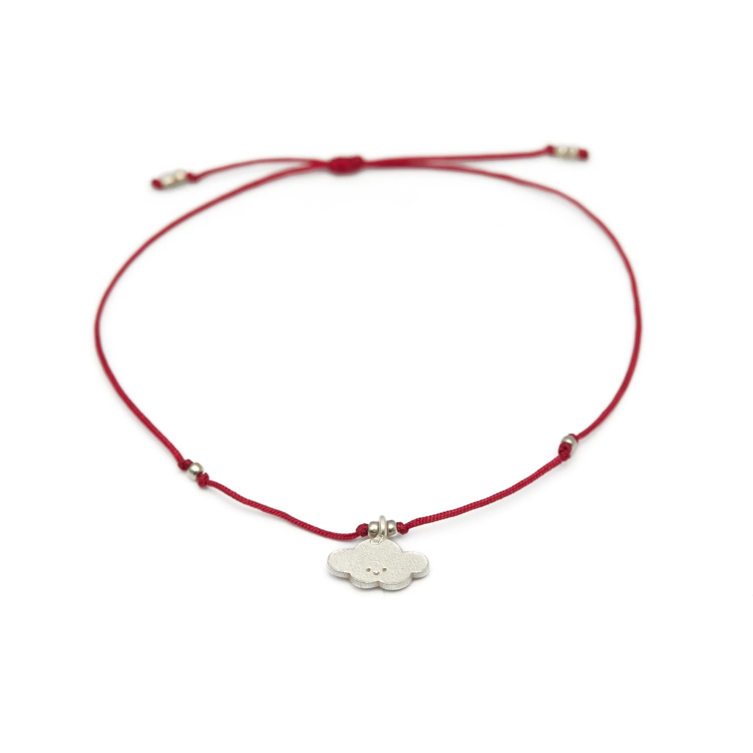 Pulsera con dije en forma de nube, con una carita calada, colgada de un cordón de satín.