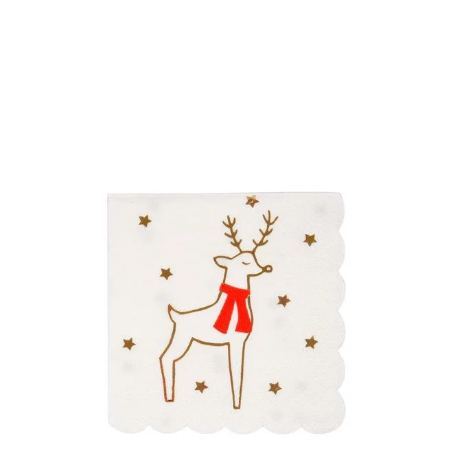 Fondo blanco y estrellas doradas en estoas servilletas ideales para Navidad. El motivo centrarl es todo un icono, un reno dorado con una bufanda roja.
