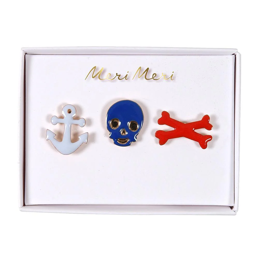 El pack contiene tres pines con forma de calavera, tibias cruzadas y ancla.