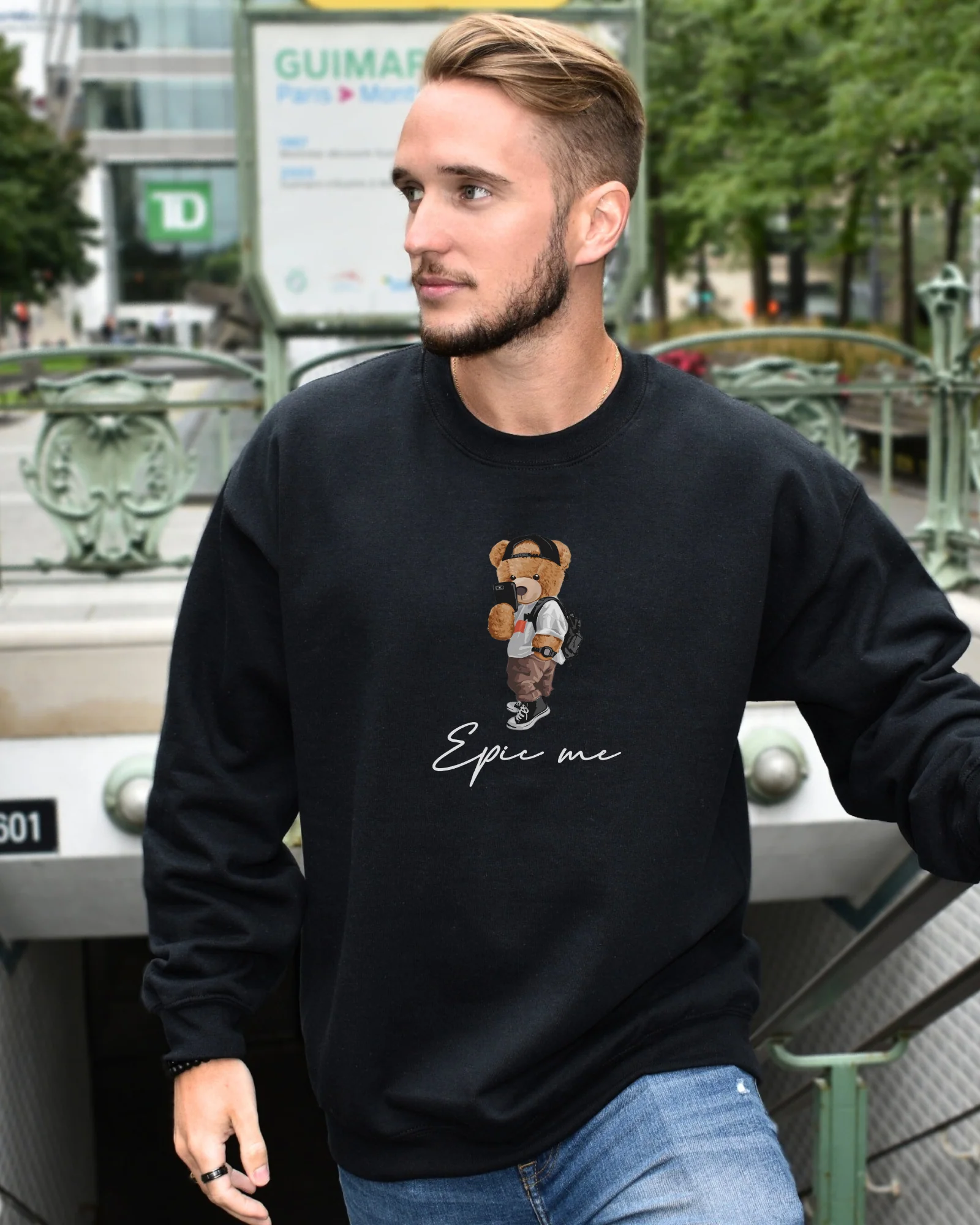 Sudadera sin capucha negra pensada para los dÃas que quieres ir sencillo, pero con esa chispa que sólo tú llevas. Algodón orgánico suave, caÃda limpia y nuestro Teddy viajero en el frontal: pequeño, icónico y con ese punto nostálgico que lo hace único.