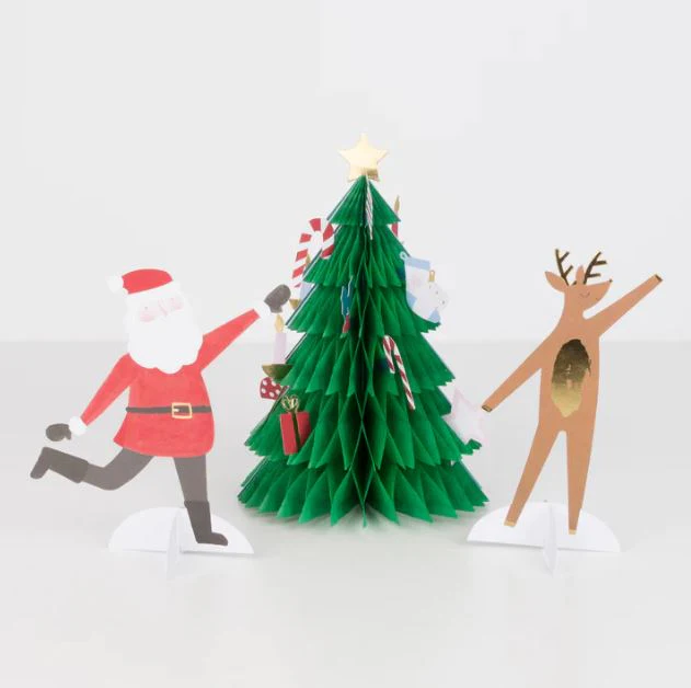 Esta increíble tarjeta es realmente especial para regalar y recibir como regalo, ya que además de felicitación también es una maravillosa decoración navideña en 3D. Cuenta con Santa, renos y un árbol 3D decorado, ¡para hacer que todos se sientan festivos! Incluye sobre.