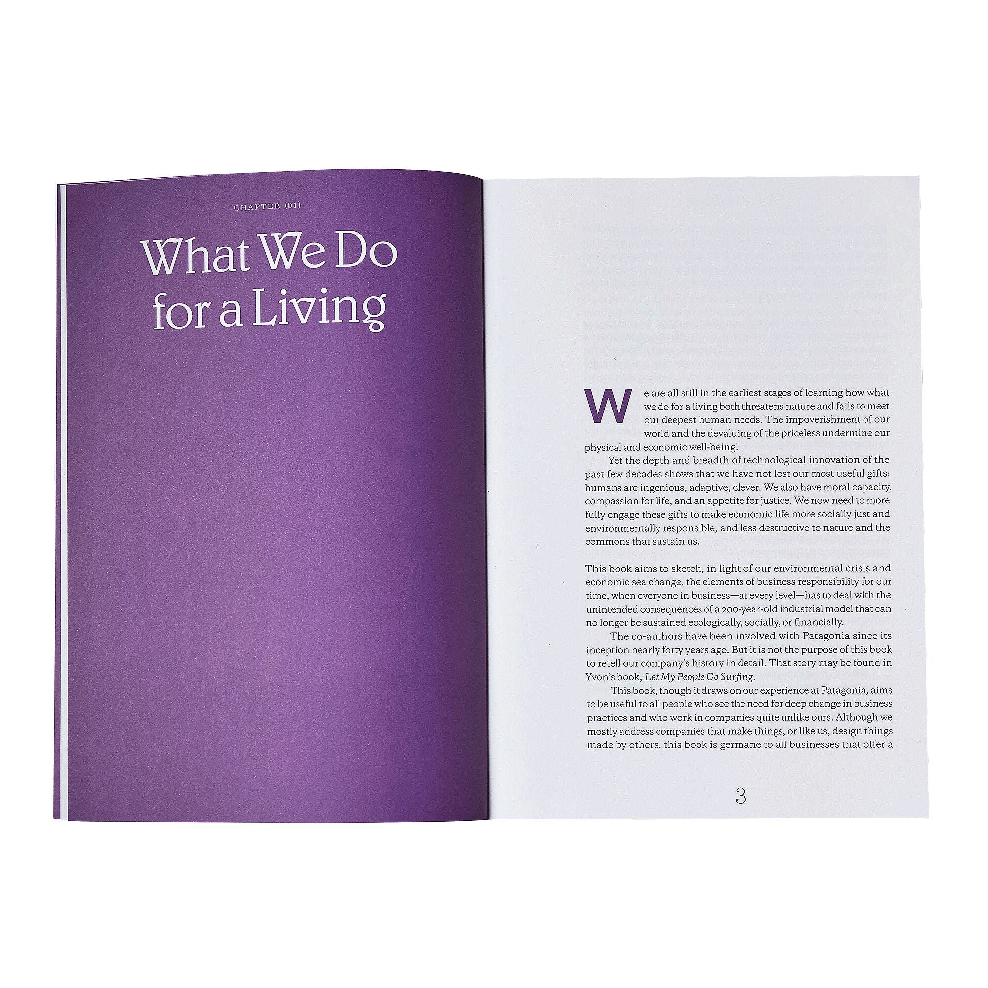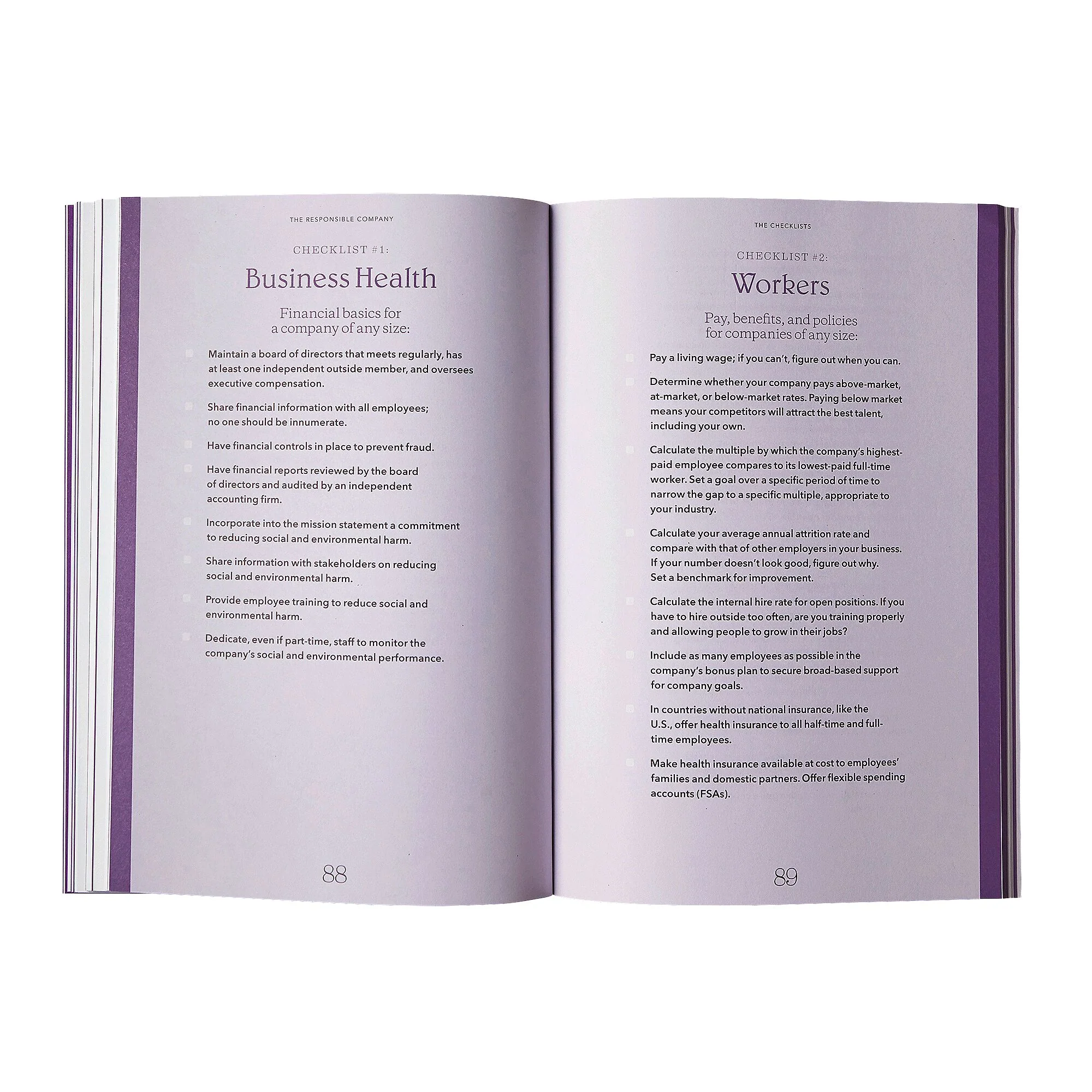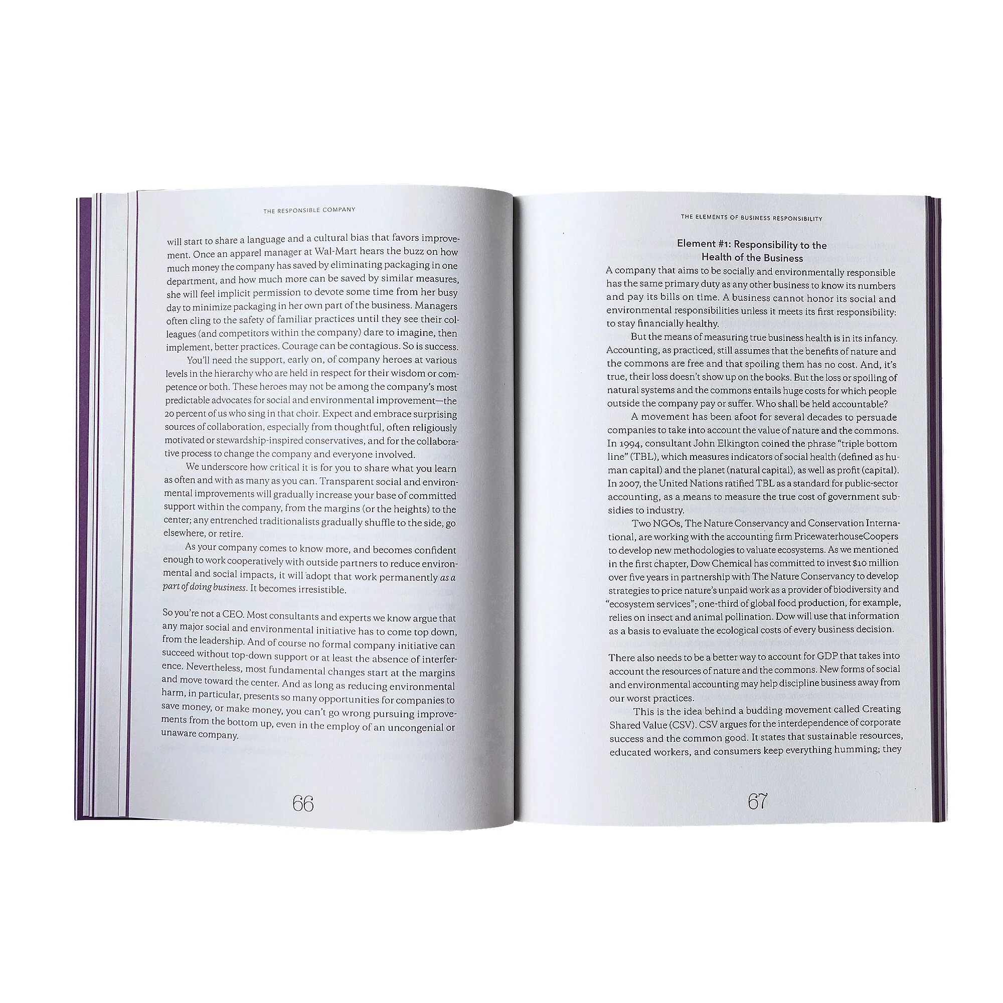 Publicado por Patagonia, The Responsible Company muestra a las empresas cómo abrirse camino a través del cambio económico en el mar y reducir la tendencia a la bancarrota ecológica. Su consejo es simple pero poderoso: reduzca su huella ambiental (y su costo disparado), haga productos legÃtimos que perduren, reclame un conocimiento profundo de su negocio y su cadena de suministro para aprovechar las oportunidades en los próximos años y gane la confianza (y negocios) que necesitará al tratar a sus trabajadores, clientes y comunidades con respeto.