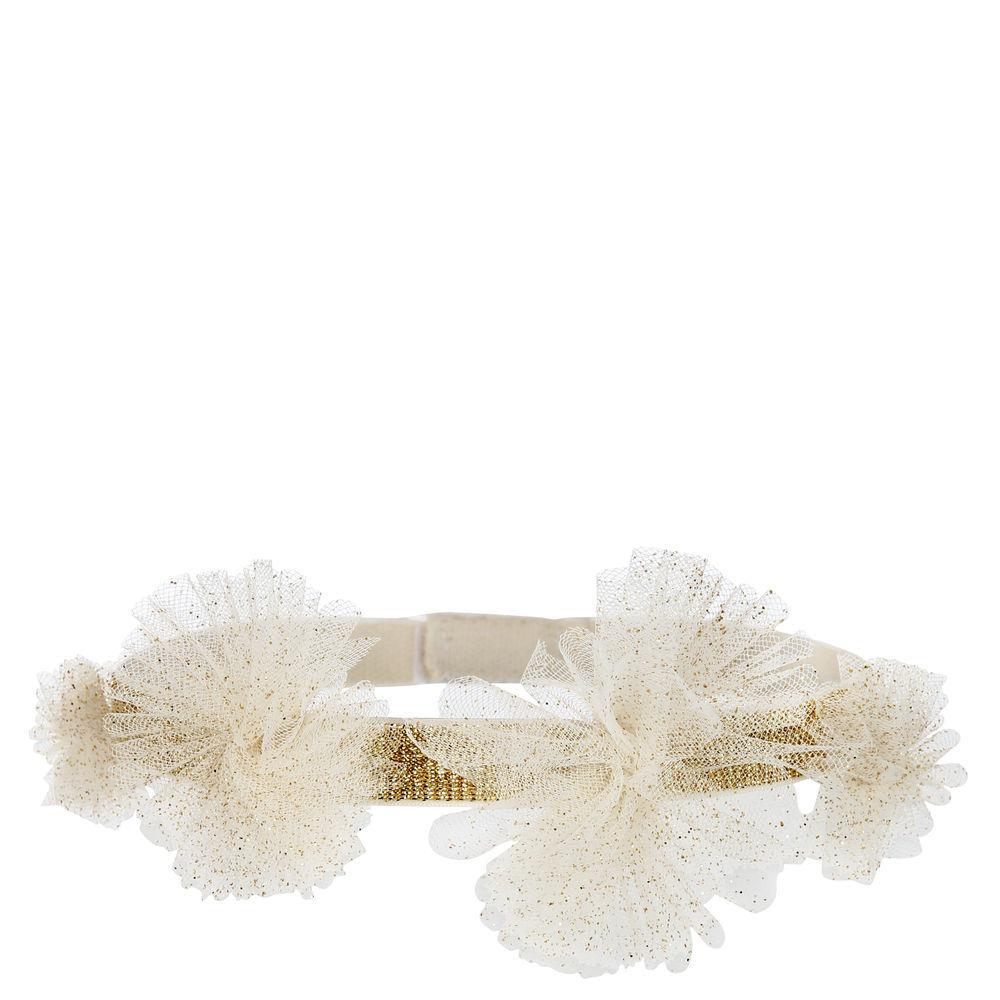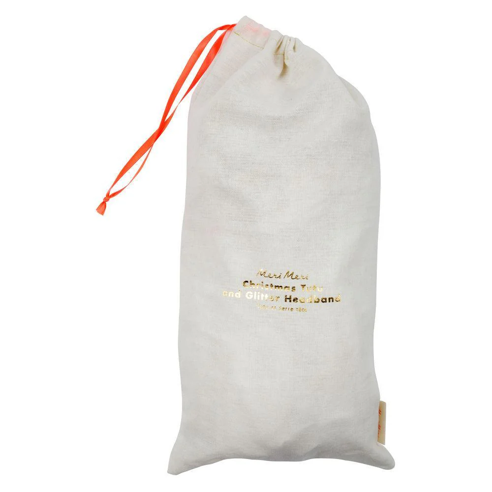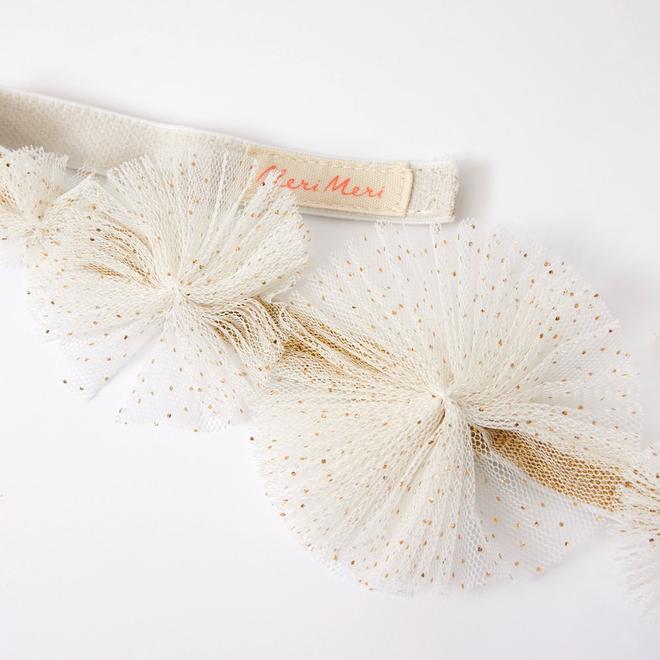El tocado lleva pompones de tul y se cierra con velcro para mayor comodidad, ambas piezas están contenidas en una bolsa regalo de algodón.