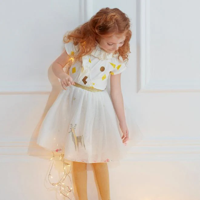Pon a tu pequeña en modo Navidad con este divertido kit de disfraz para las festividades. Contiene una falda de tul brillante adornada con un reno y brillantes lentejuelas de colores, tiene cintura elástica.
