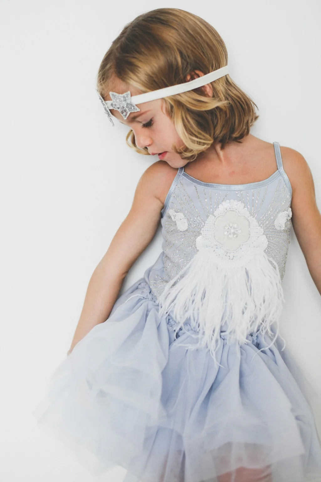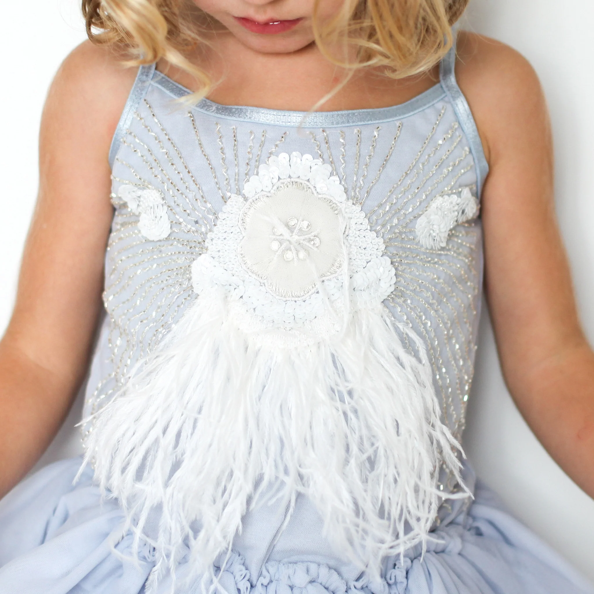 Su corazón brincará de alegría hasta lo más profundo del océano azul cuando lleve este precioso tutú. Relucirá de amor con el cuerpo adornado con delicadas plumas de avestruz, pequeñas cuentas de cristal platay racimos de lentejuelas de un blanco nacarado.