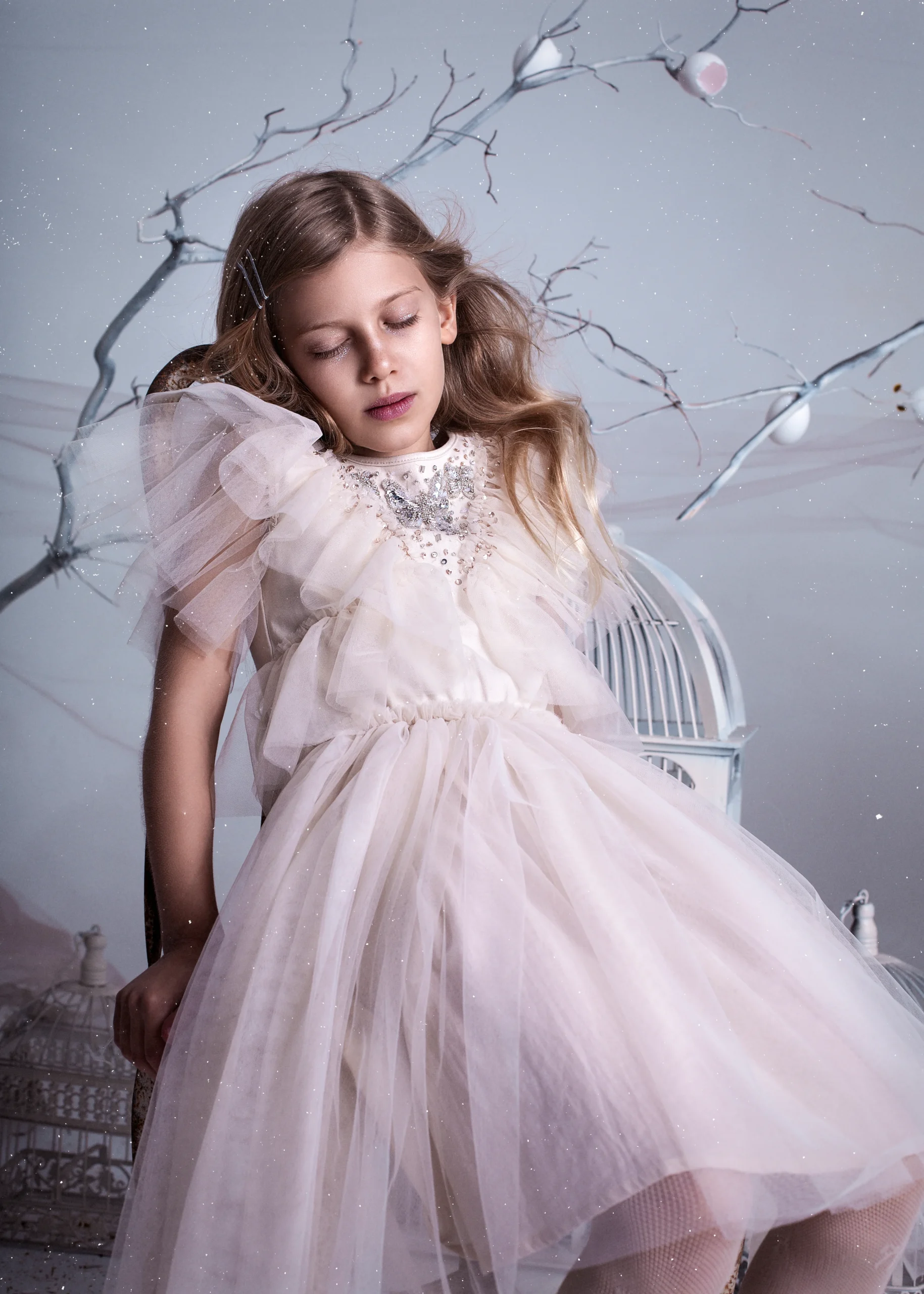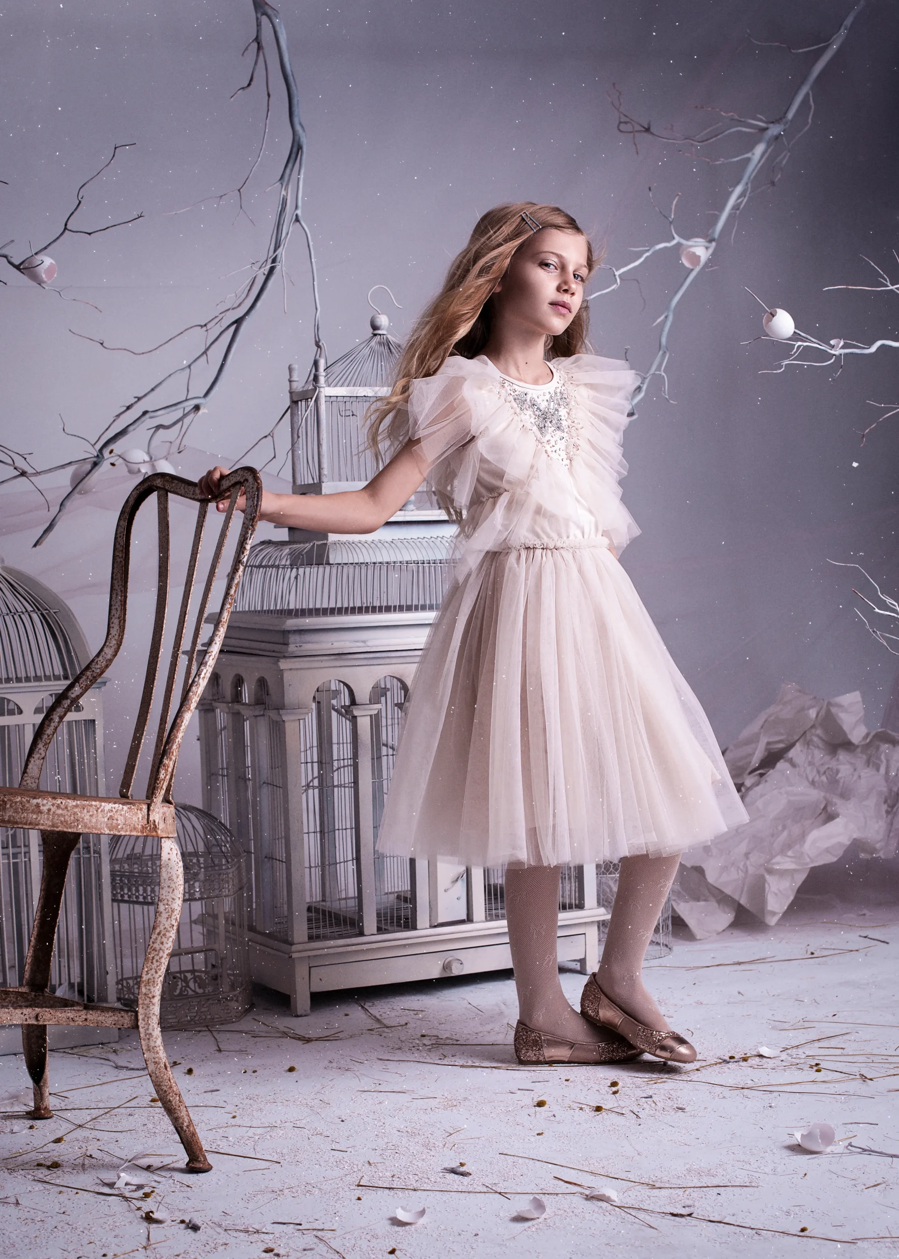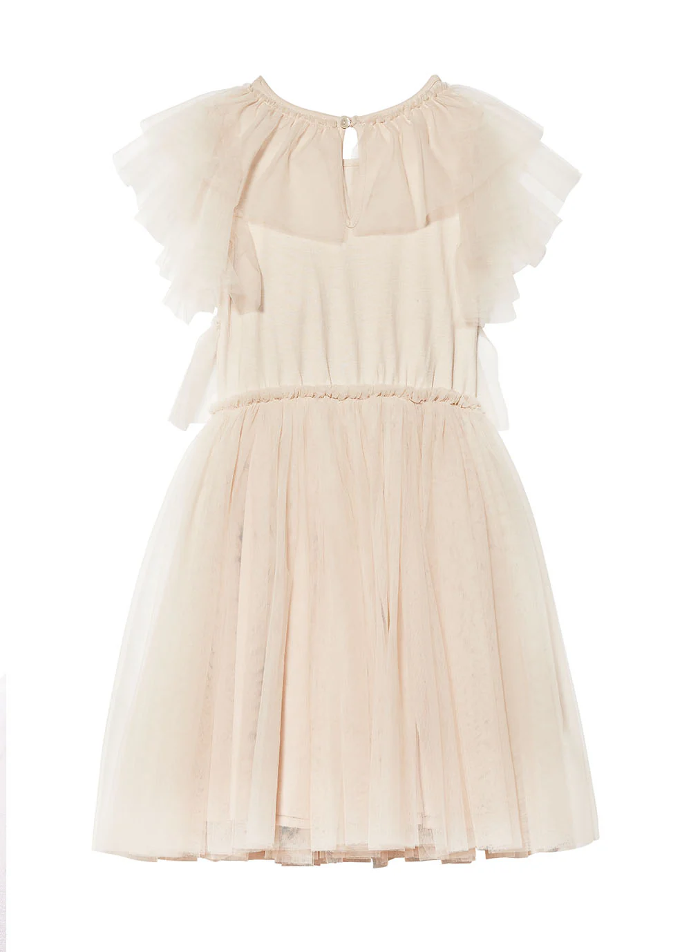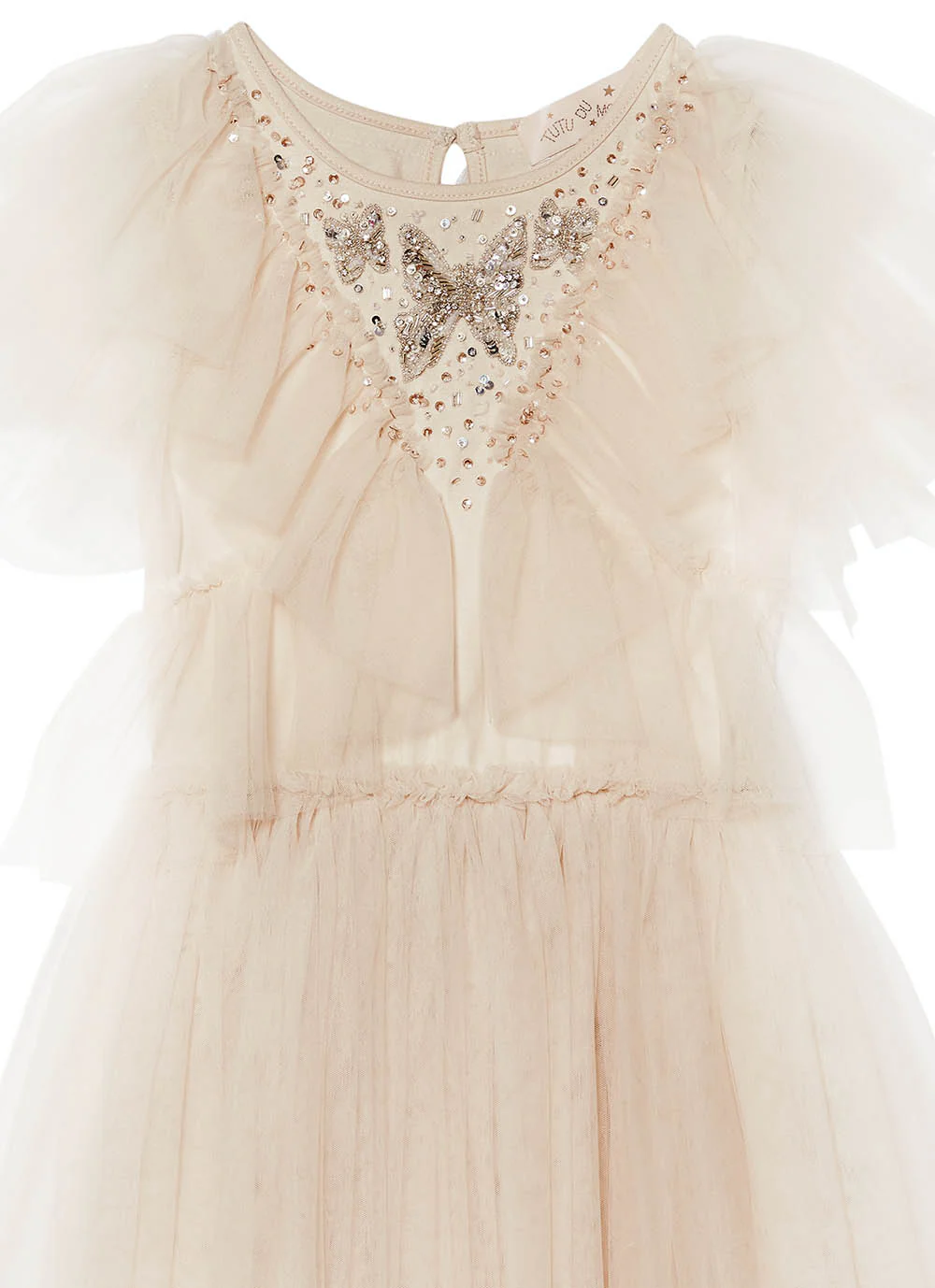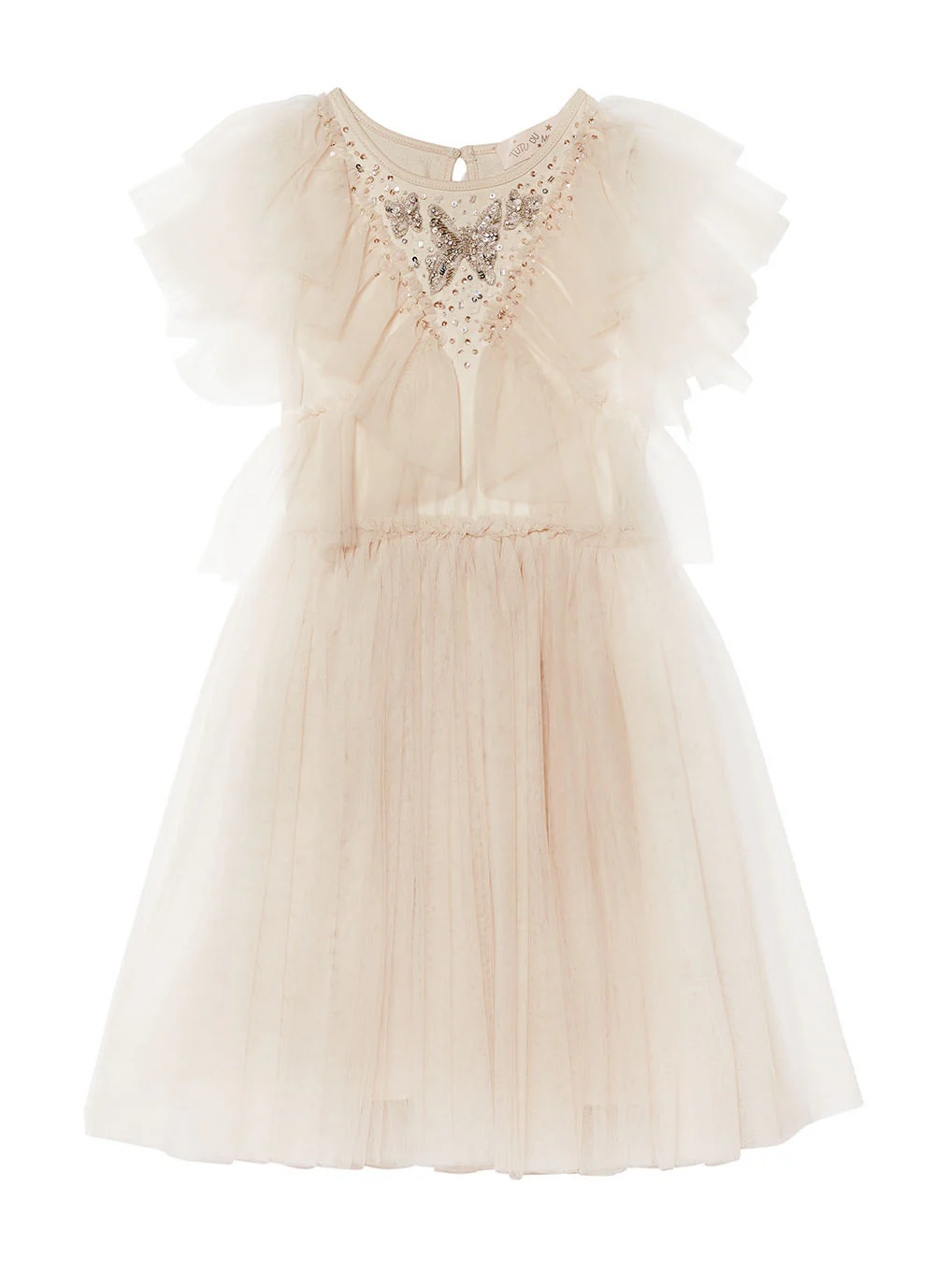 Este vestido hará que cualquier chica se sienta (aún más) preciosa. Las vaporosas mangas de tul son un dulce añadido a este adorable vestido que presenta un cuerpo con volantes verticales de tul y un motivo de mariposa con abalorios aplicados a mano. La cintura elástica marca el arranque de una falda clásica de media largura con capas de enagua para dar volumen.