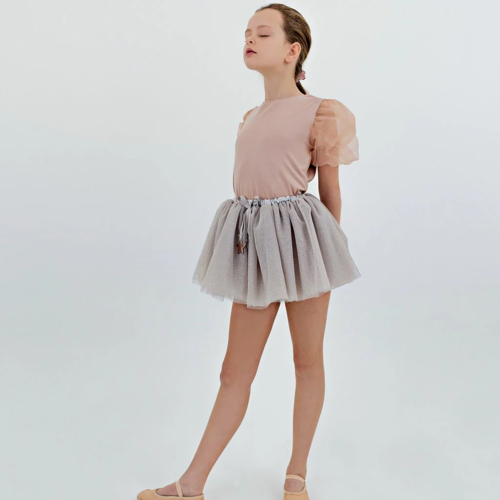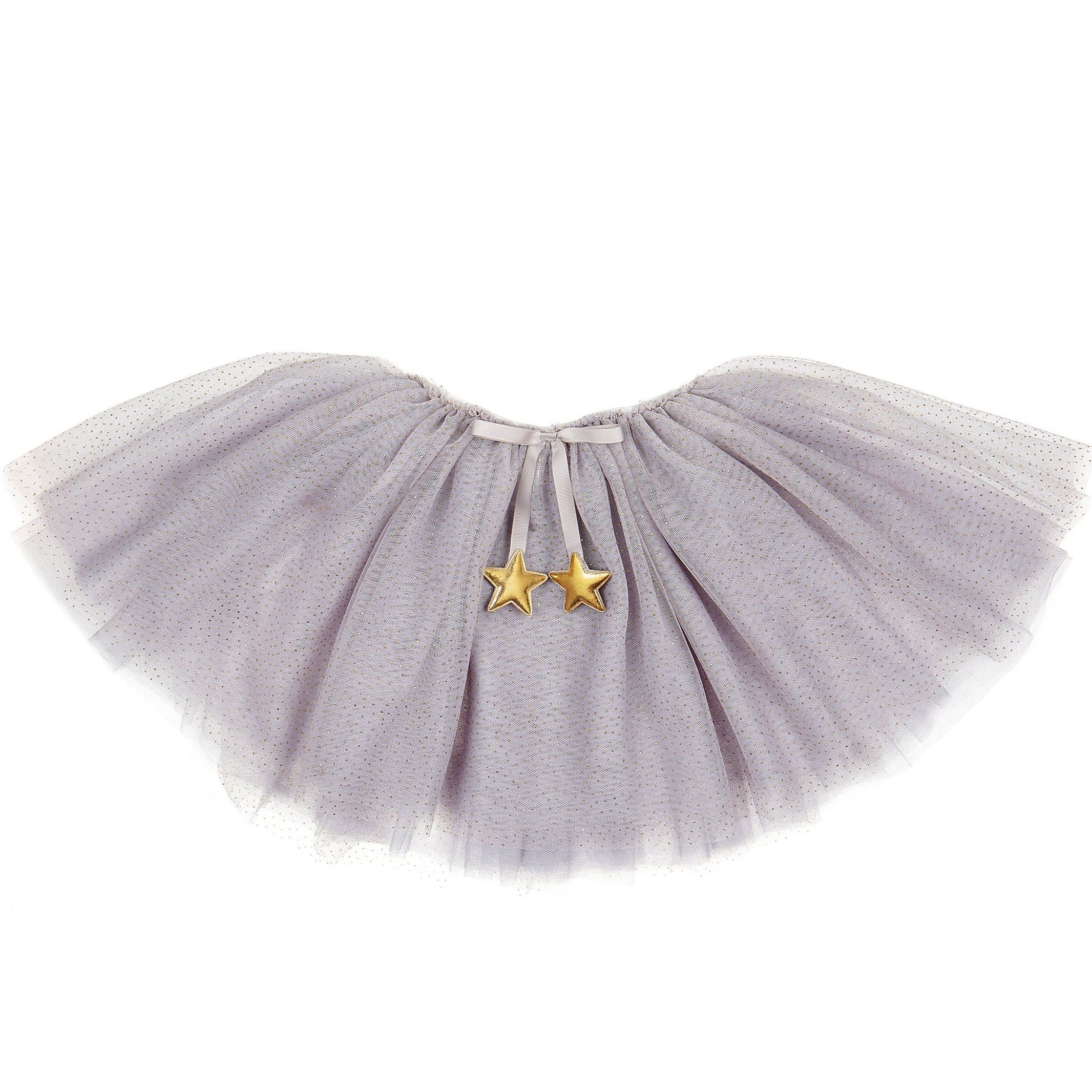 Este tutú viene en un precioso tono gris claro. Con puntitos dorados de glitter y seis capas de tul, este tutú tiene una cintura elástica para encajar un amplio rango de tallas entre los 3 y los 10 años.