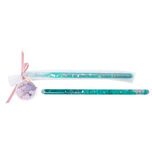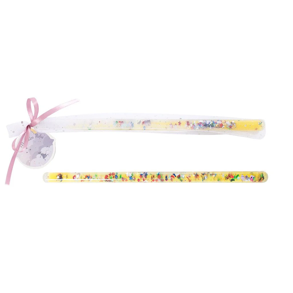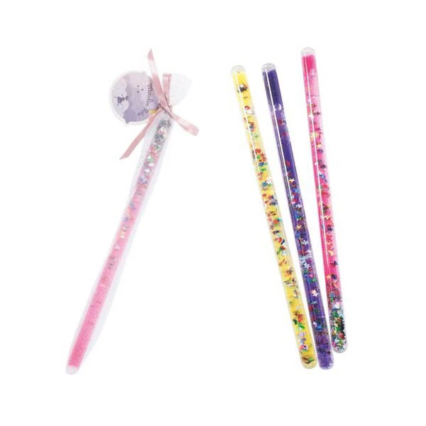 Esta varita trransparente deja ver en su interior estrellas, lunas y corazones flotando en color con destellos glitterw, y es el complemento perfecto de un hada, maga o hechicera.