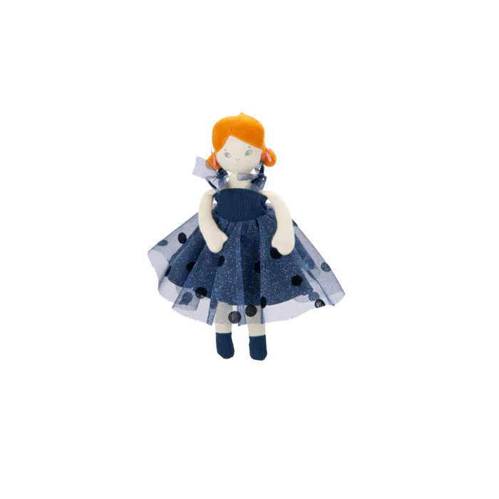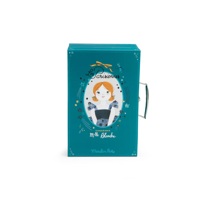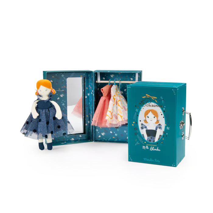 ¡Mademoiselle Blanche, una de las parisinas de Moulin Roty, nos invita a su vestidor! Una maleta armario con espejo integrado, barra para colgar en madera y perchas estampadas, en las que se encuentran tres conjuntos ordenados en un cajón. Para una salida por la ciudad o una tarde en pijama, elije su outfit ideal. Muñeca incluida.