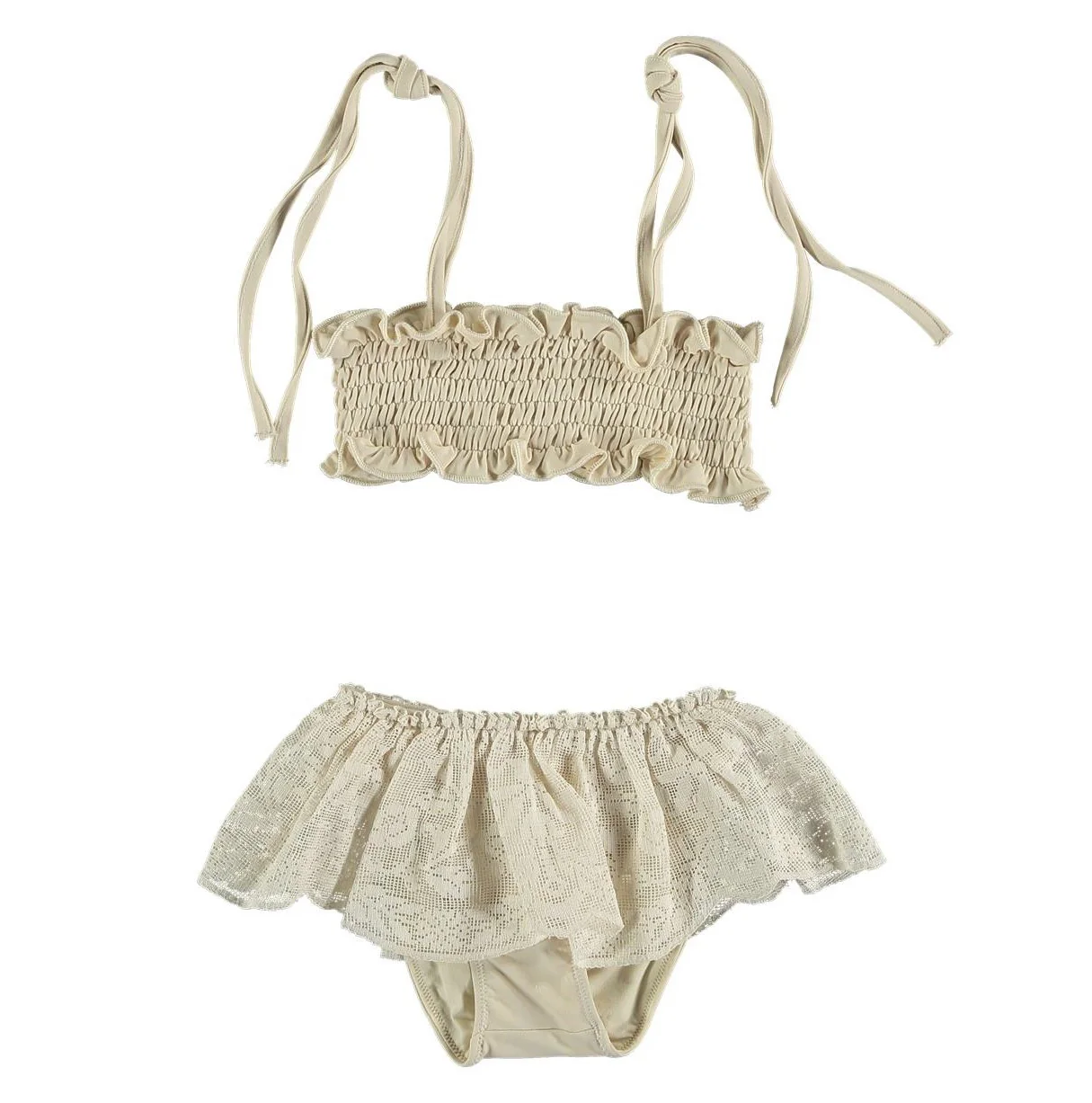 Bikini lycra con volante de encaje de bolillo- beige